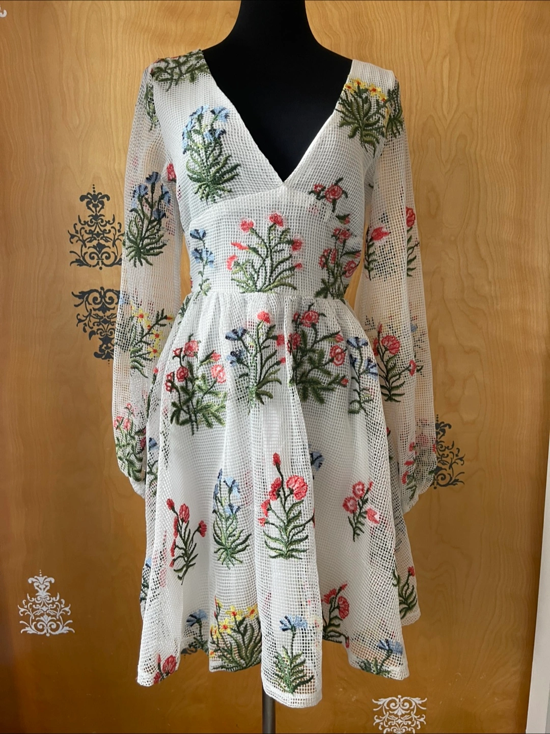 Vintage 2000s Y2K Long Sleeve Knit Mesh Dress Embroidered Flower Design White Low Cut S/M
