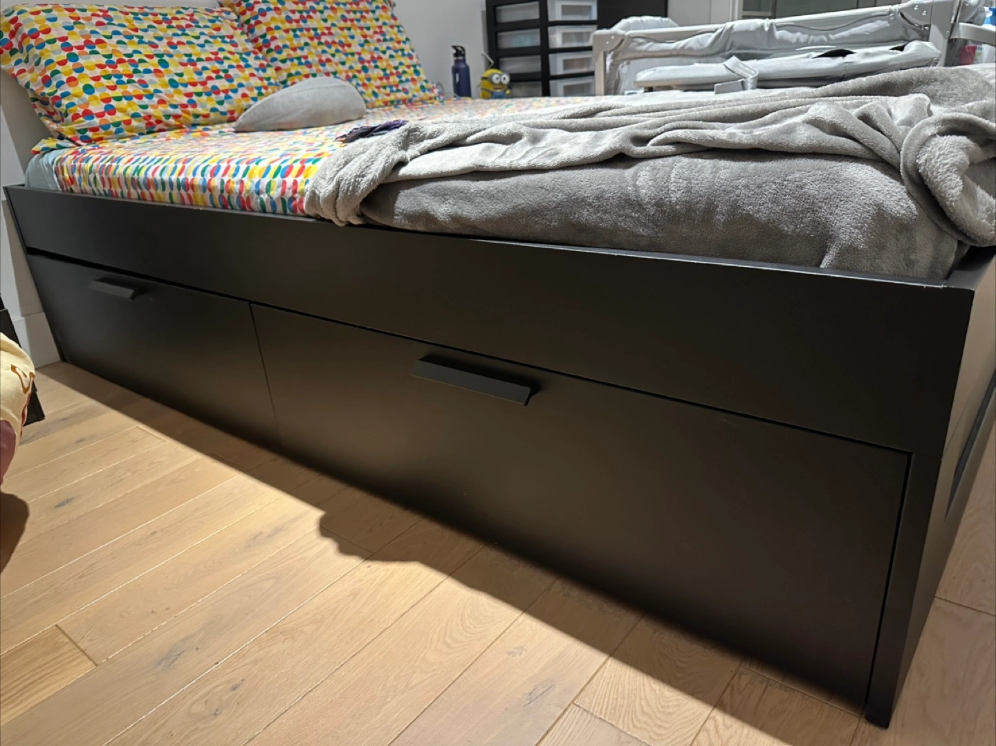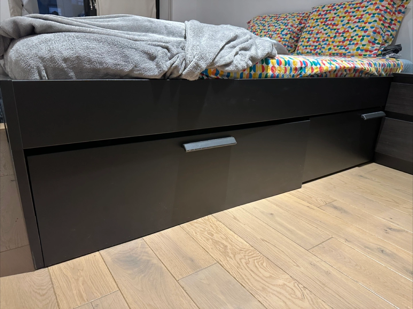 Drawers are worn — best for light storage or simply as a sturdy bed frame. A couple need some fixing.