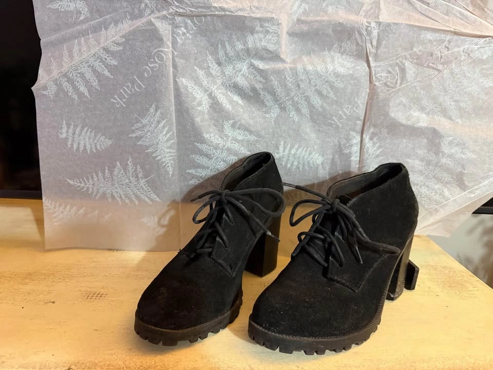 ALDO Black suede heeled booties in good used condition. Have a good tread on them for fall/winter time as well. Selling because they no longer fit.