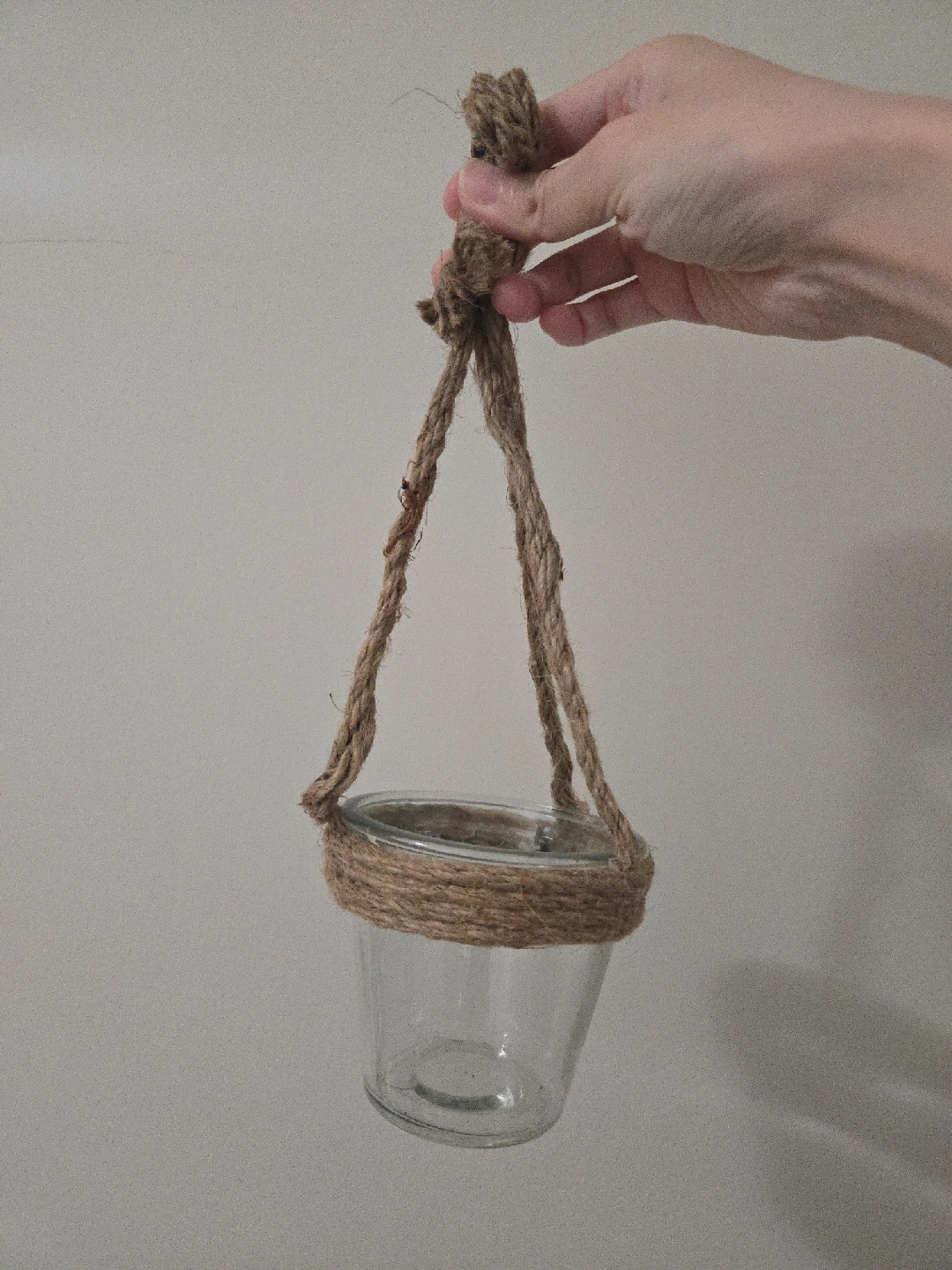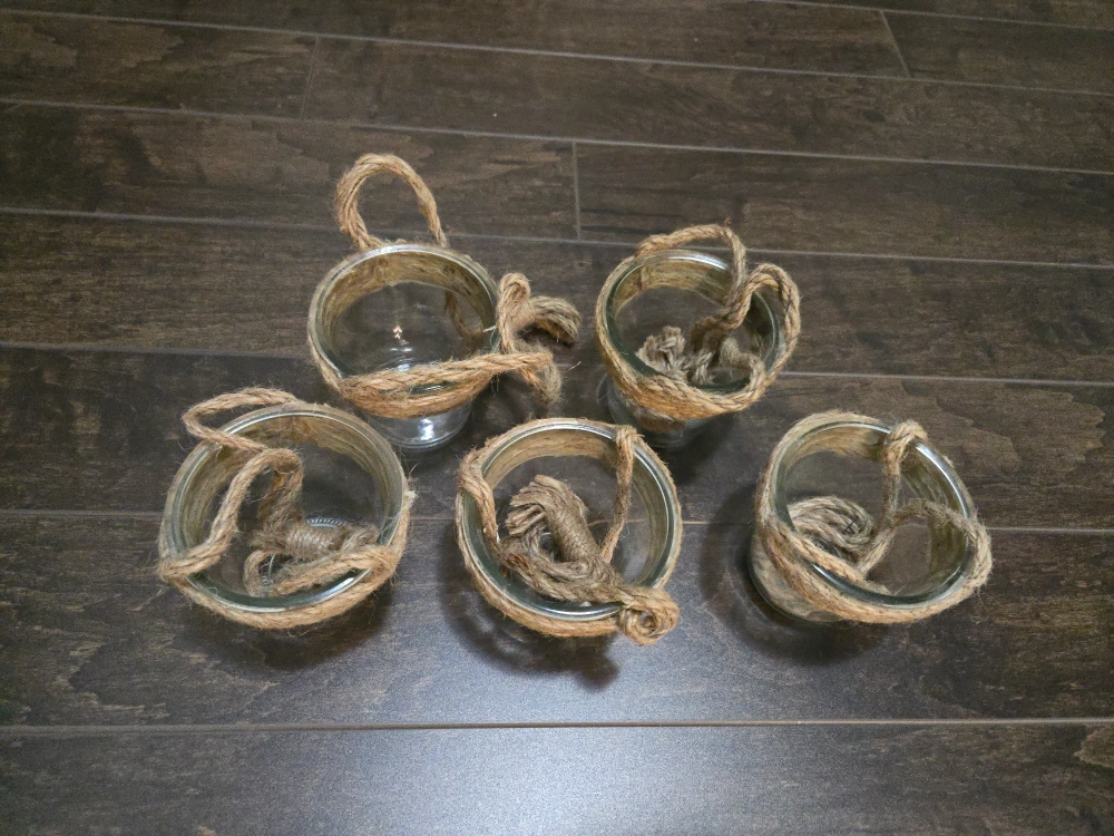 Selling a set of hanging glass cups, perfect for adding a rustic touch to your home decor! It's wrapped with jute rope, giving it a natural and cozy vibe. Ideal for small plants or candles.