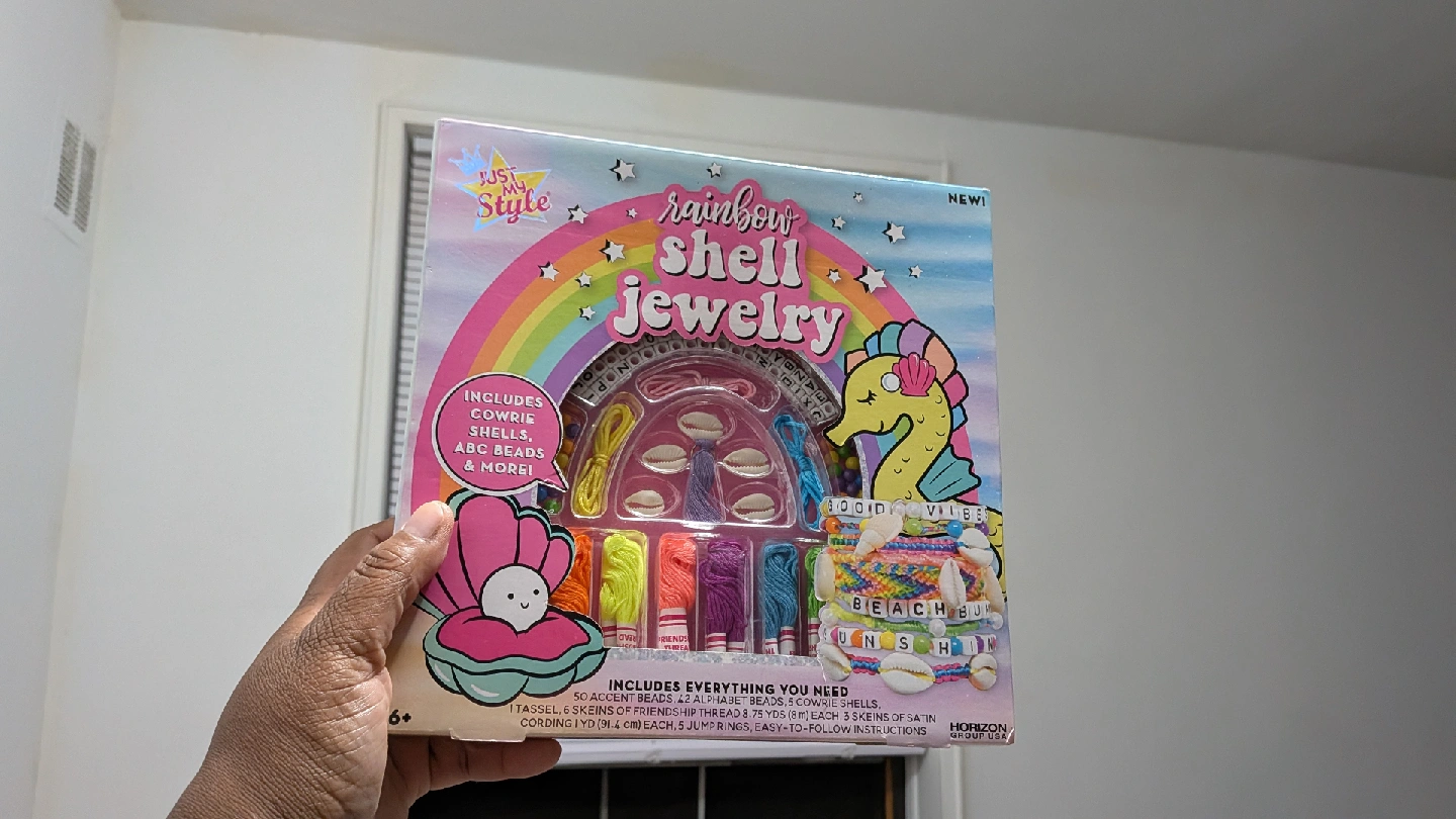 New in box! This Just My Style Rainbow Shell Jewelry kit includes everything you need to make some awesome shell jewelry! It includes cowrie shells, ABC beads, and more! It also includes 50 accent beads, 12 alphabet beads, 50 flower shells, 1 tassel, 6 skeins of friendship thread (2.75 yds/2.5m each), 3 skeins of satin cording (1yd/0.91m each), 5 jump rings, and easy-to-follow instructions.