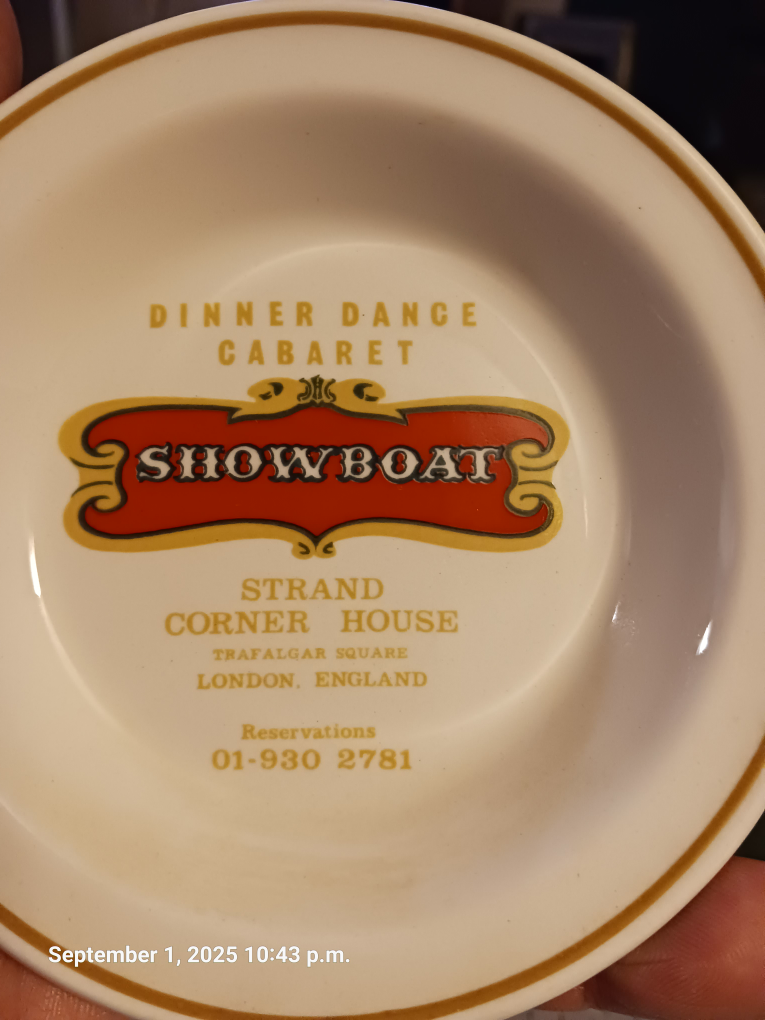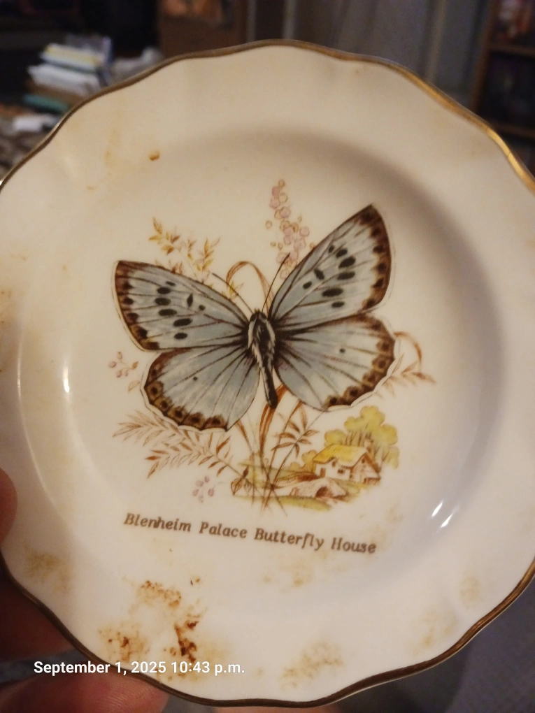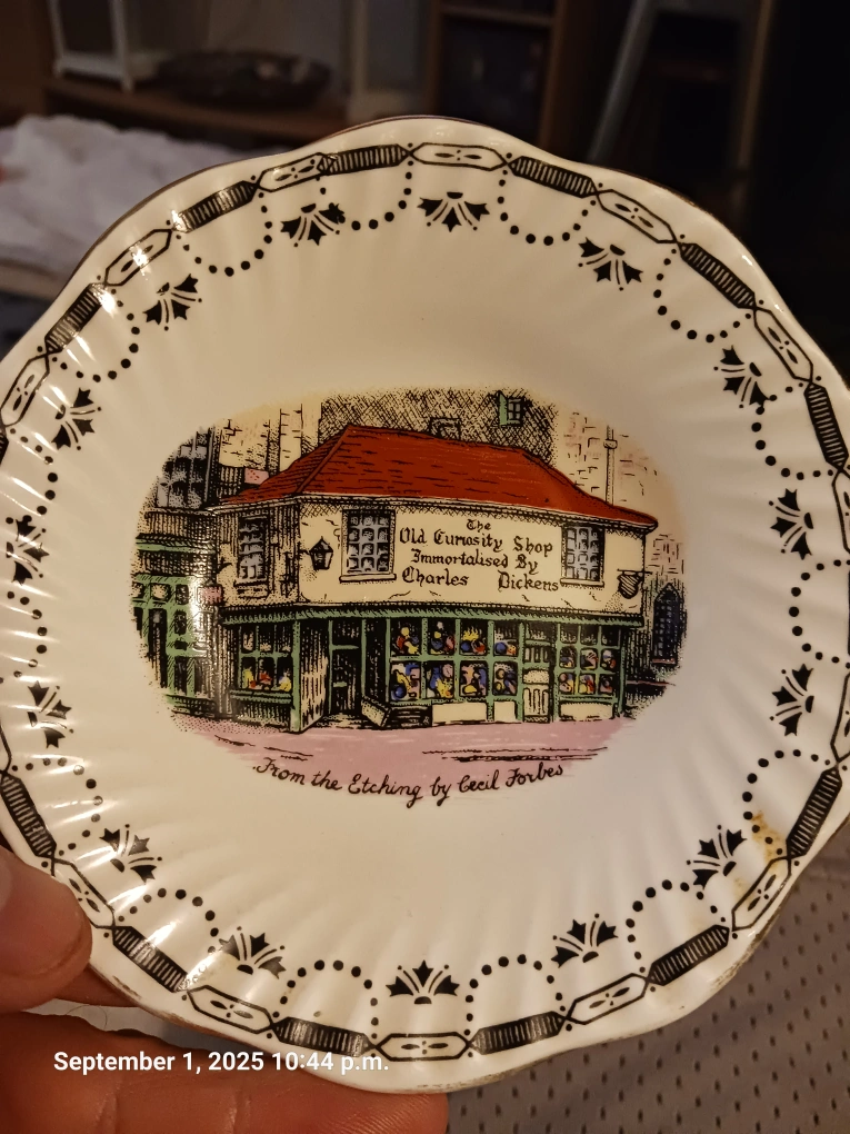 Selling a set of vintage saucer plates featuring unique designs! One plate showcases "The Old Curiosity Shop Immortalised By Charles Dickens" from an etching by Cecil Forbes. Another plate features a butterfly design from Blenheim Palace Butterfly House. The third plate features the Showboat. These plates are from Rosina China and Ridgway Steelite, made in England. They'd make a lovely addition to any collection or a charming decorative piece!