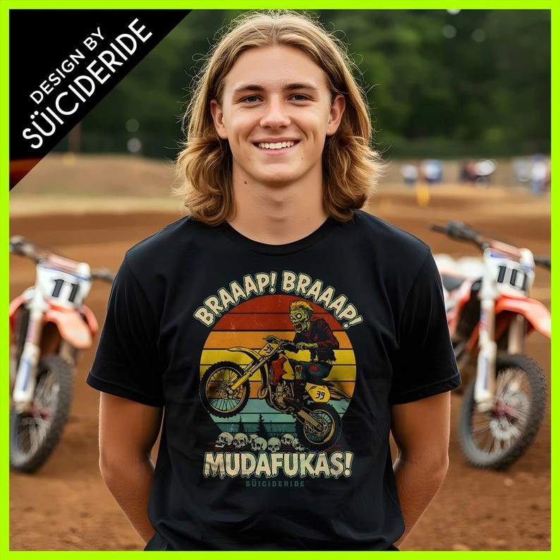 Unleash your wild side with our 'Braaap! Braaap! Mudafukas! Zombie Dirt Bike' t-shirt! This badass black tee is perfect for those who live for the thrill of motocross and love to showcase their fun attitude. Whether you’re tearing up the track or just hanging out with friends, this shirt is your go-to for a unique style statement.