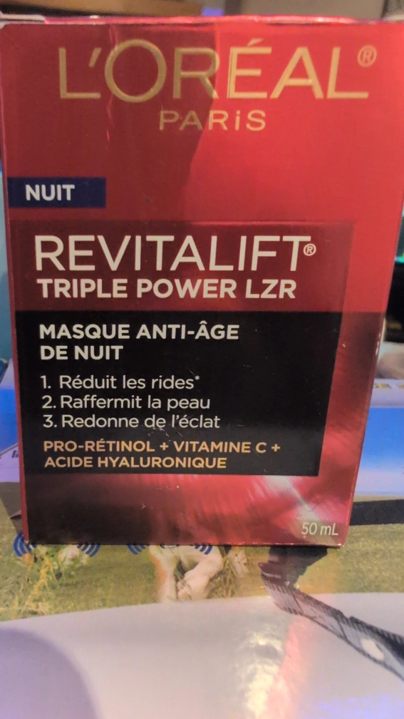 Selling a unopened L'Oreal Revitalift Triple Power LZR Anti-Age Night Mask. It's an overnight mask with Pro-Retinol, Vitamin C, and Hyaluronic Acid. This mask helps reduce wrinkles and firms skin. It is suitable for sensitive skin, dermatologist-tested, and doesn't clog pores. The size is 50mL.
