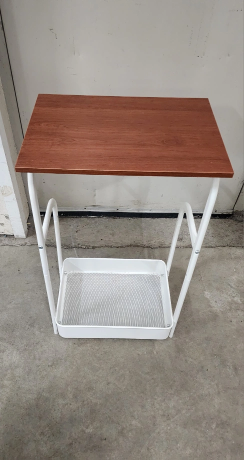 This side table features a wooden top and a white metal frame, offering a simple and functional design. It includes a lower shelf for extra storage or display. It would be perfect for small spaces, or as a bedside table!