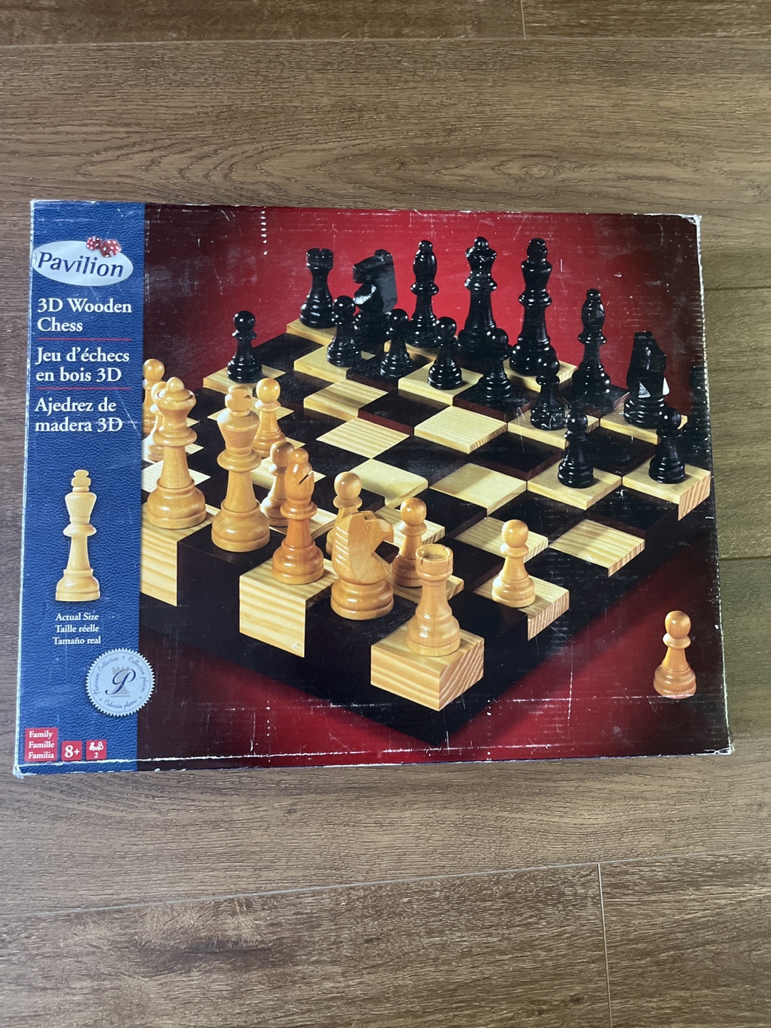 Selling a Pavilion 3D wooden chess set. It's a classic game for the whole family, recommended for ages 8+! The box shows the actual size of the pieces. Great for some family fun!