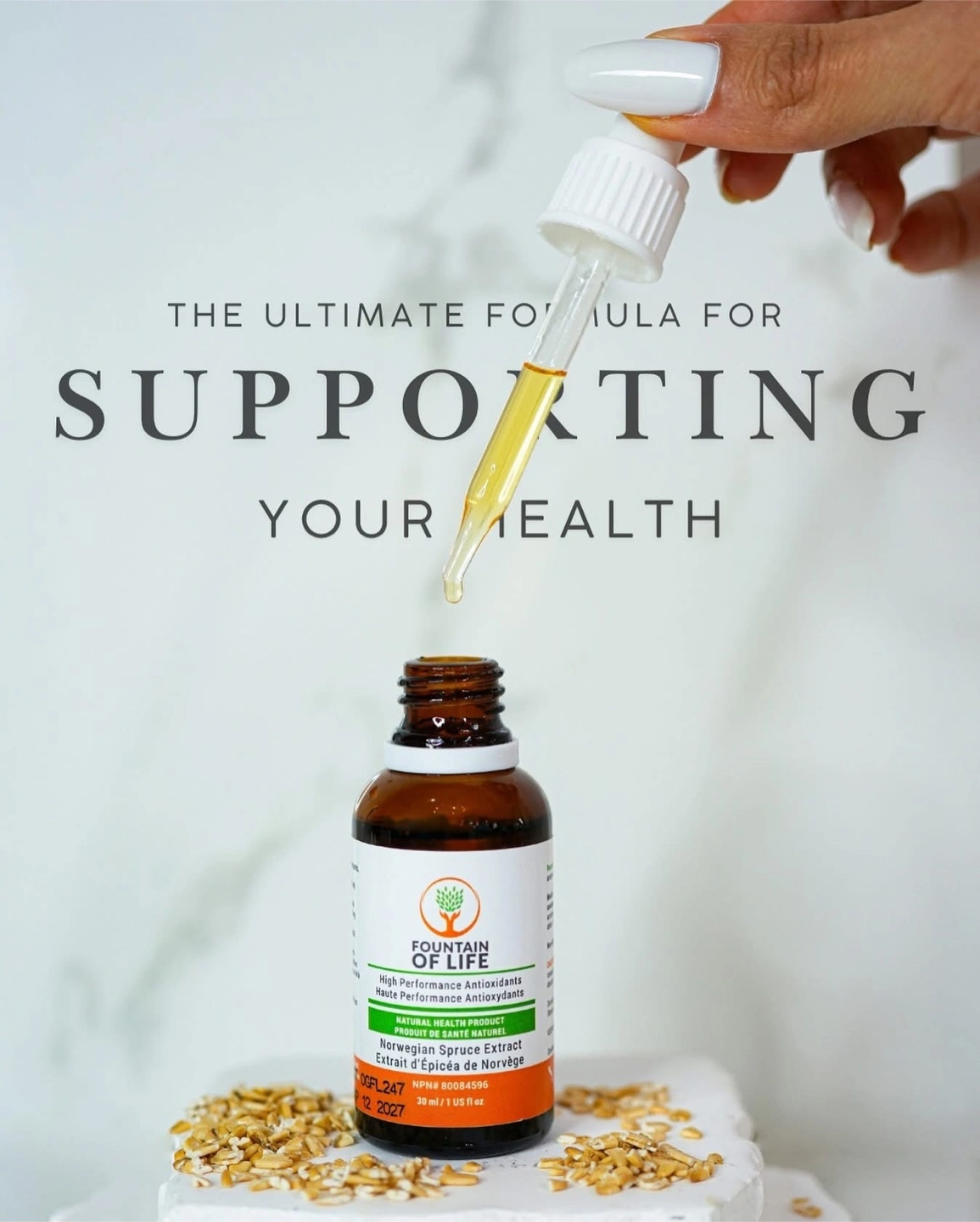 Fountain of Life captures the power of the Picea Abies extract from the Norwegian Spruce growing in Northern Finland. Thriving under the harshest of conditions, this tree has adapted to the extreme environment in which it lives. Researchers discovered that this tree contains the most powerful source of lignans in nature. Lignans are antioxidants found in the cell walls of plants.