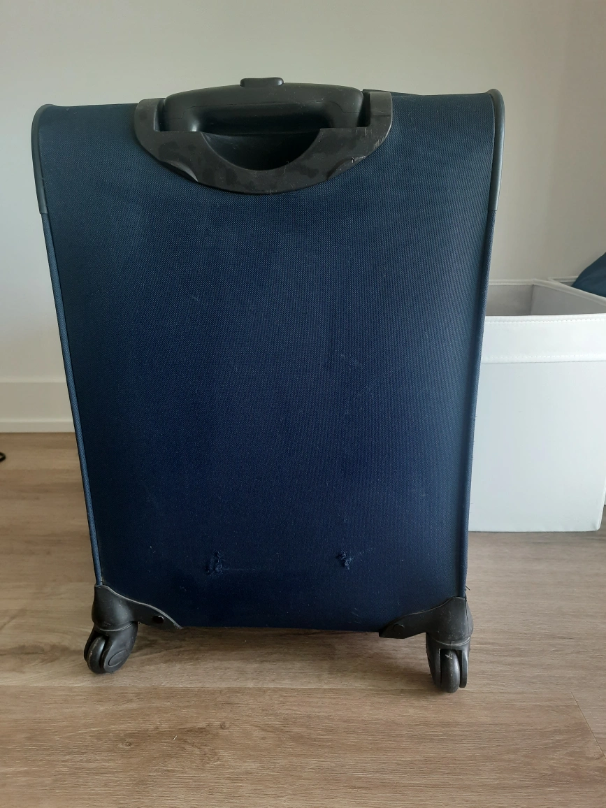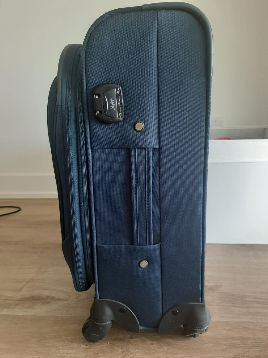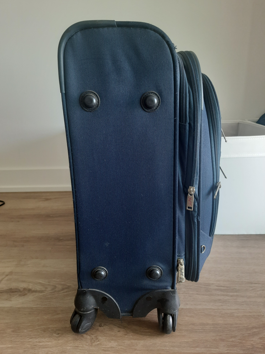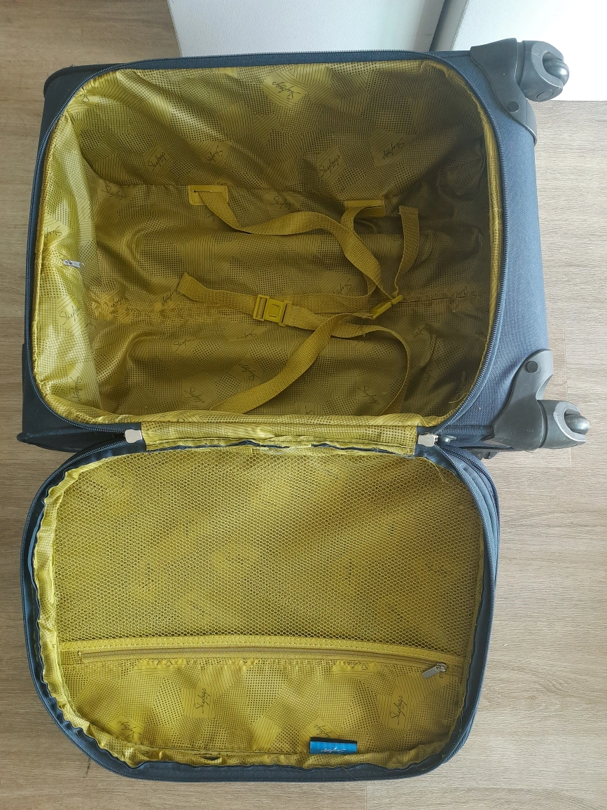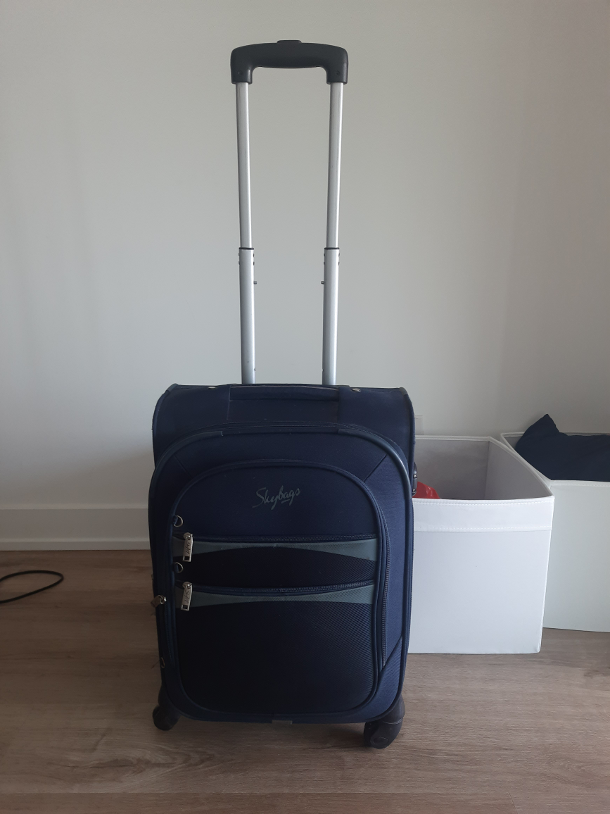 Selling a Skybags carry-on luggage in navy blue. It's in good condition and perfect for short trips or as an underseat bag on flights. It has a retractable handle and wheels for easy maneuvering. The interior features straps to keep your belongings secure.