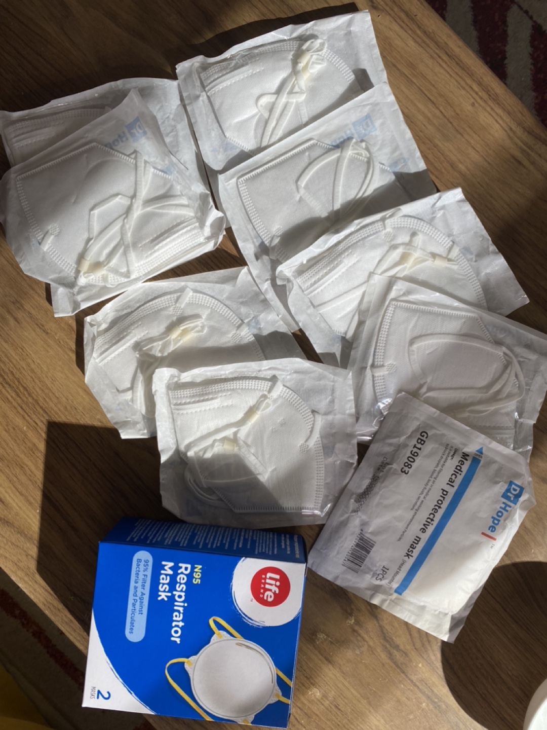 They are brand new and still in their original packaging.1 Life Brand N95 masks (1 mask left) and 9 individually packed Dr. Hope medical protective masks are included.