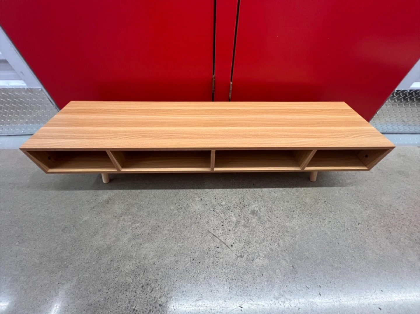 Selling a wood TV stand. It features a minimalist design with multiple open compartments for storage. Perfect for any living room!
