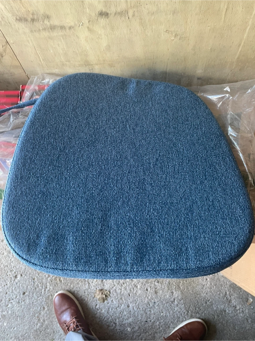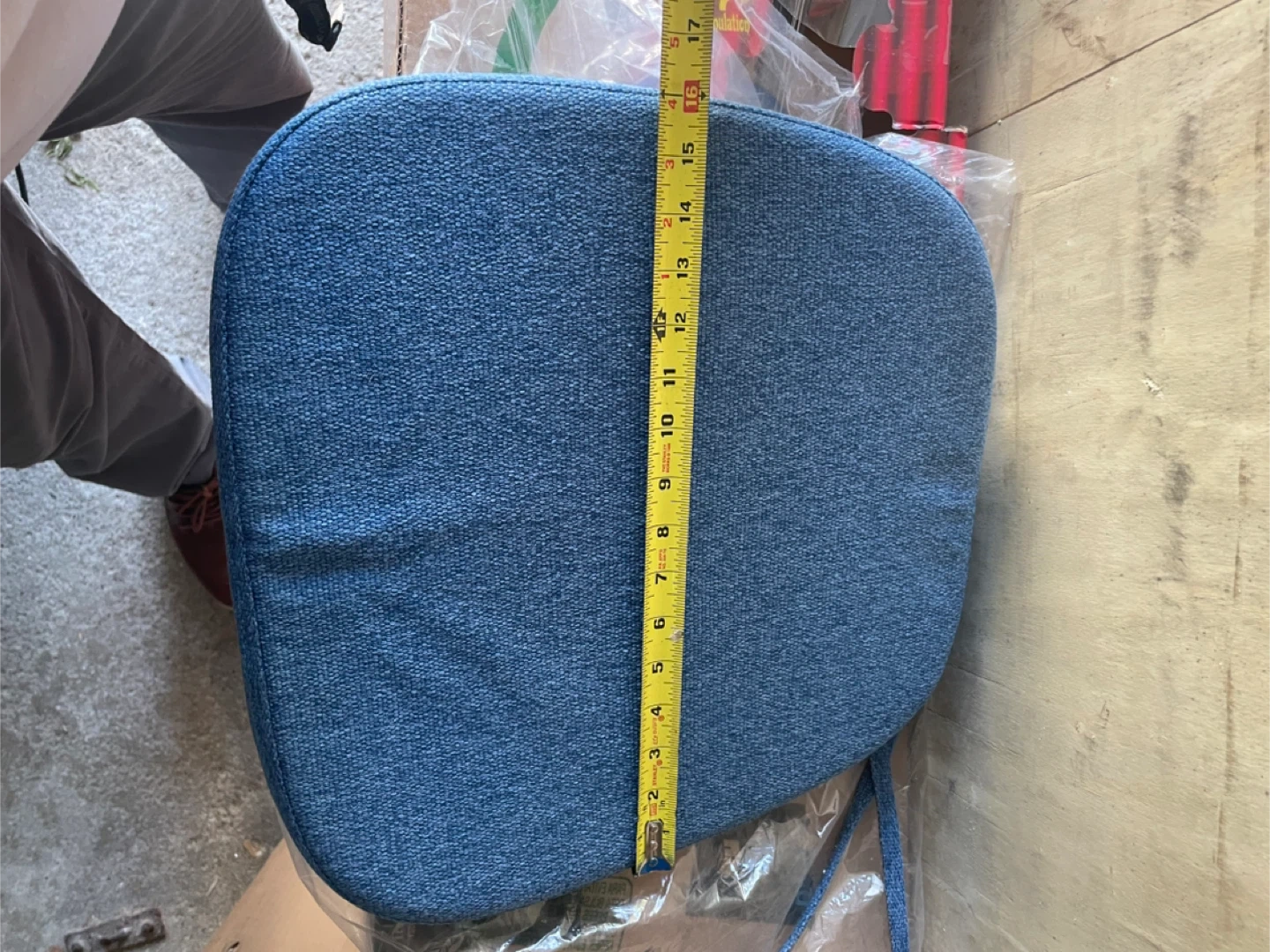 Here's a comfy blue chair pad! It measures approximately 16 inches by 18 inches. Perfect for adding a bit of cushion to your favourite chair