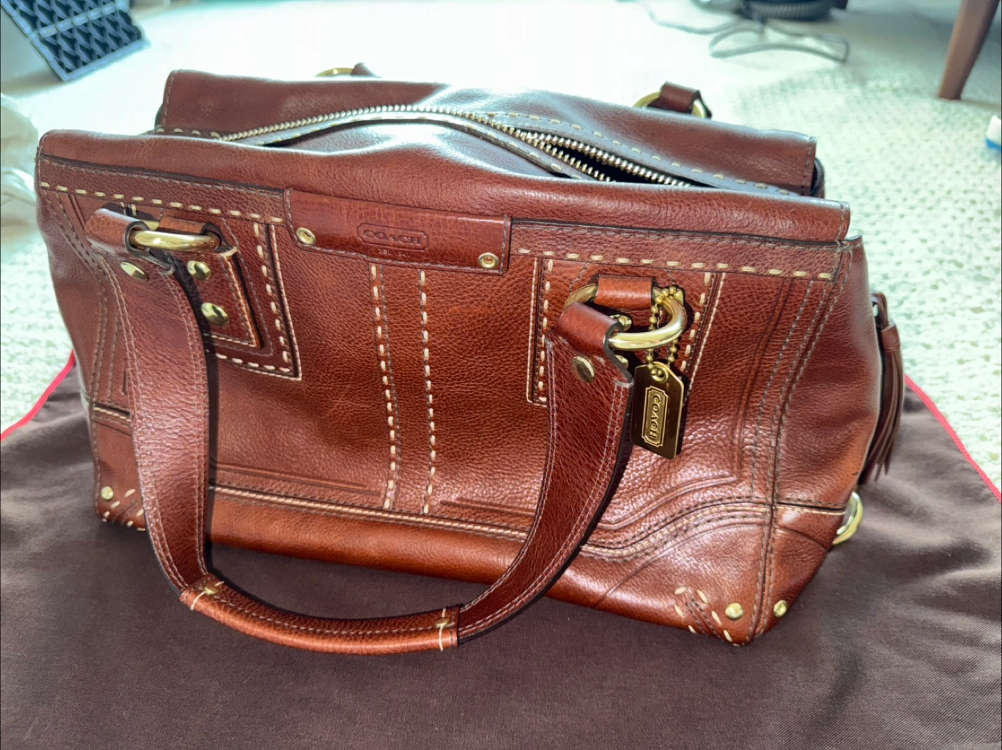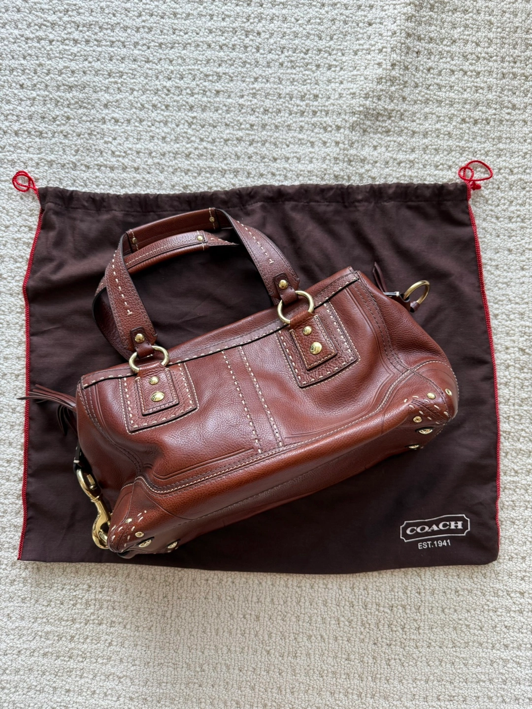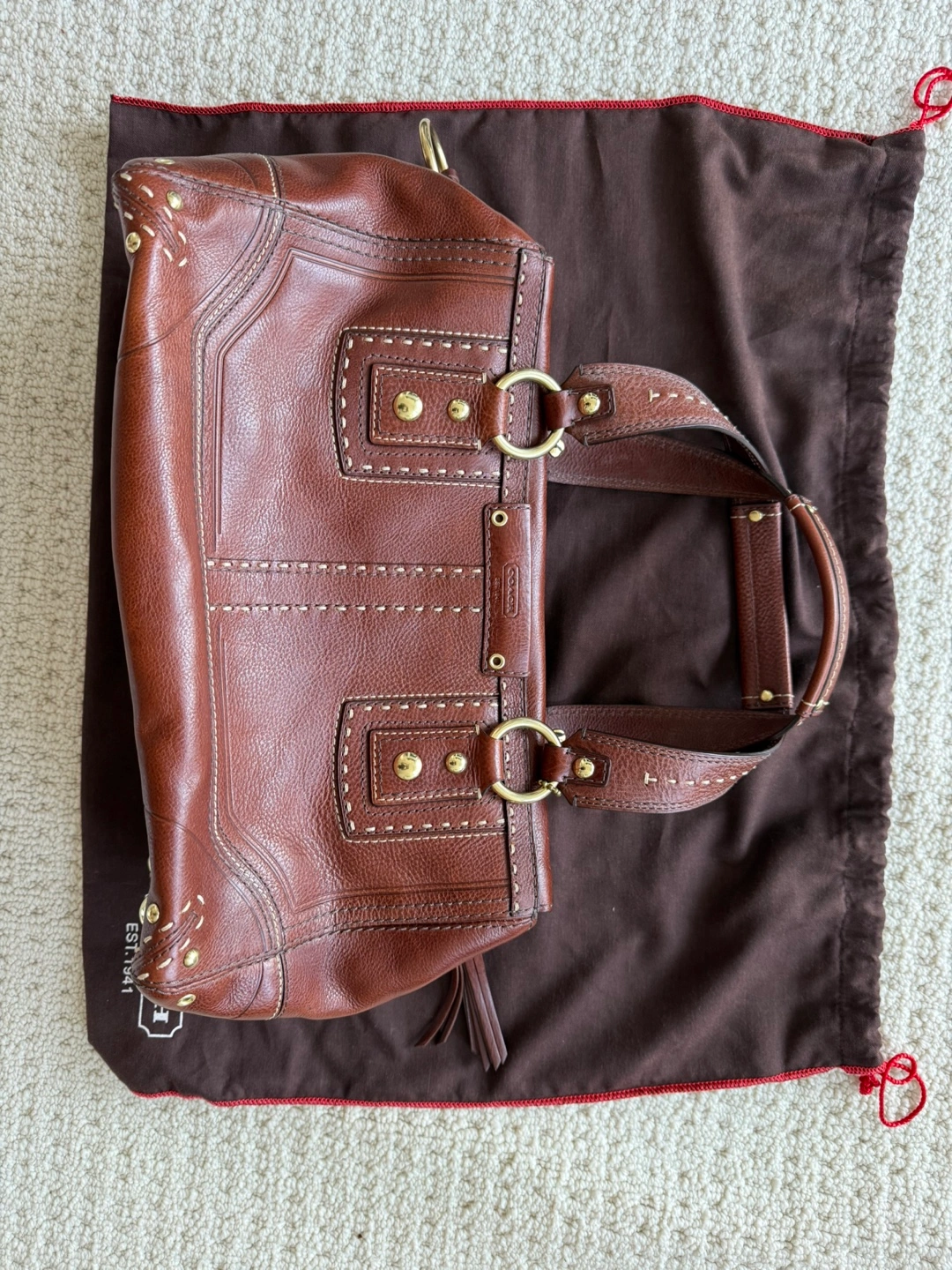 This is a lovely Coach satchel handbag in cognac leather. It's in great condition and comes with its original dust bag. Perfect for everyday use!