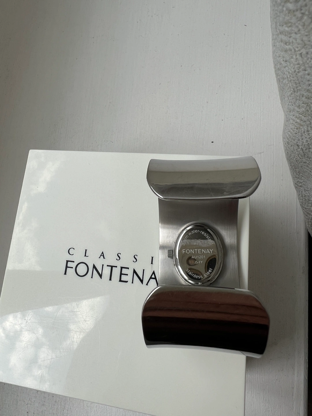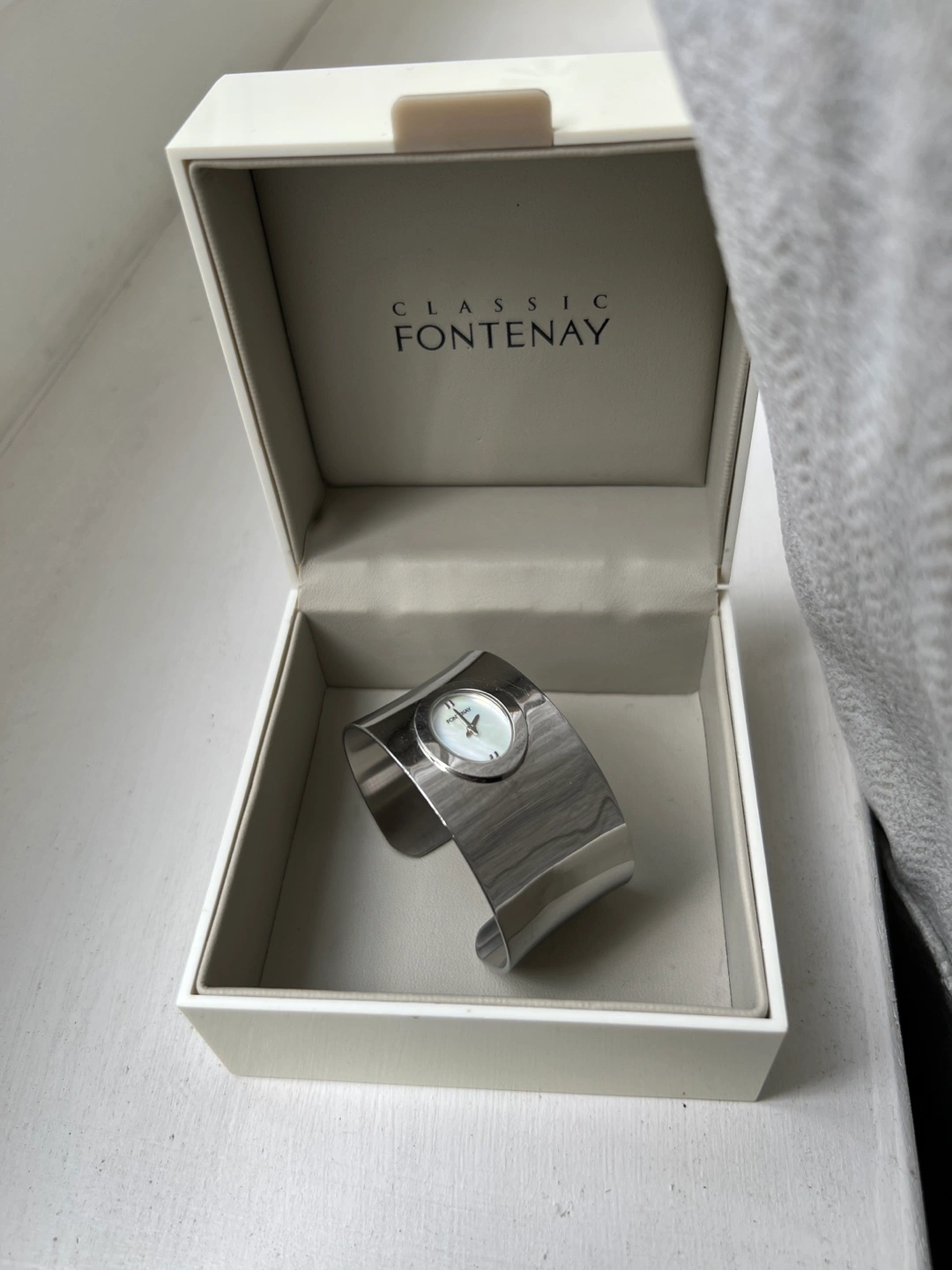 Selling a beautiful Classic Fontenay cuff watch in silver! It comes with its original box. This stylish timepiece is perfect for adding a touch of elegance to any outfit. It's in great condition and ready for a new home