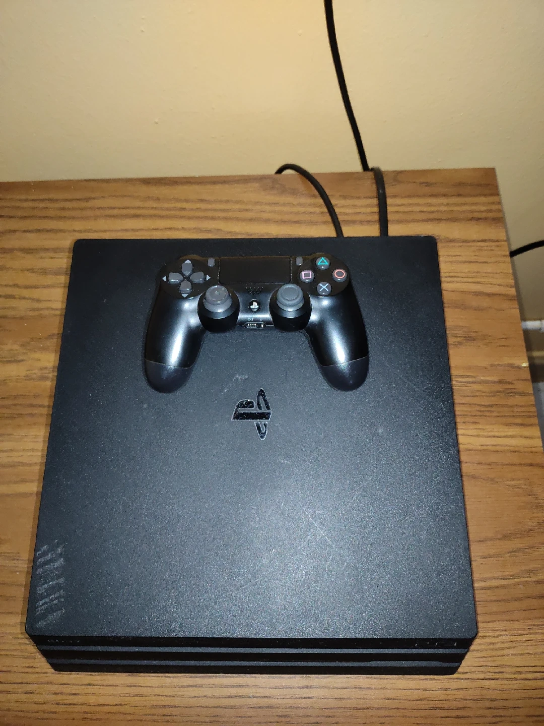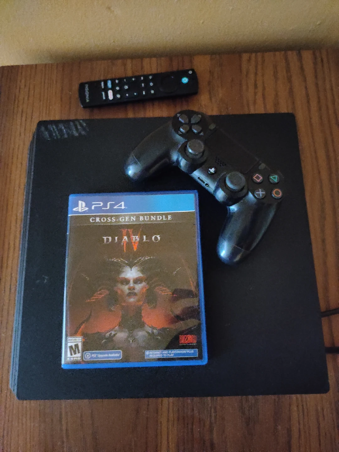 Selling a PlayStation 4 Pro 1TB! 1 controller(no stick drift) and Diablo IV. Micro USB charger for controller. READ: controller port and hdmi port are slightly loose but fully functional and working great!!! Would consider trades/partial cash for sealed sports card boxes(NBA, NFL, UFC) Thanks for looking!!!