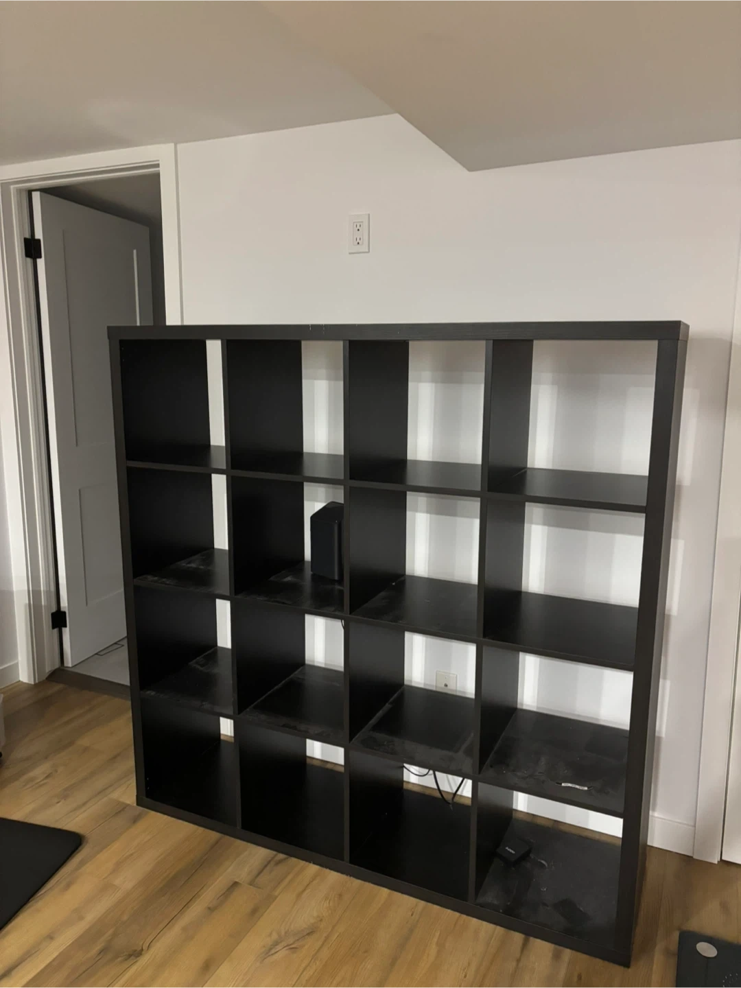 Selling a black shelf unit! It has 4x4 cubes, perfect for storage or display. In good condition and ready for a new home
