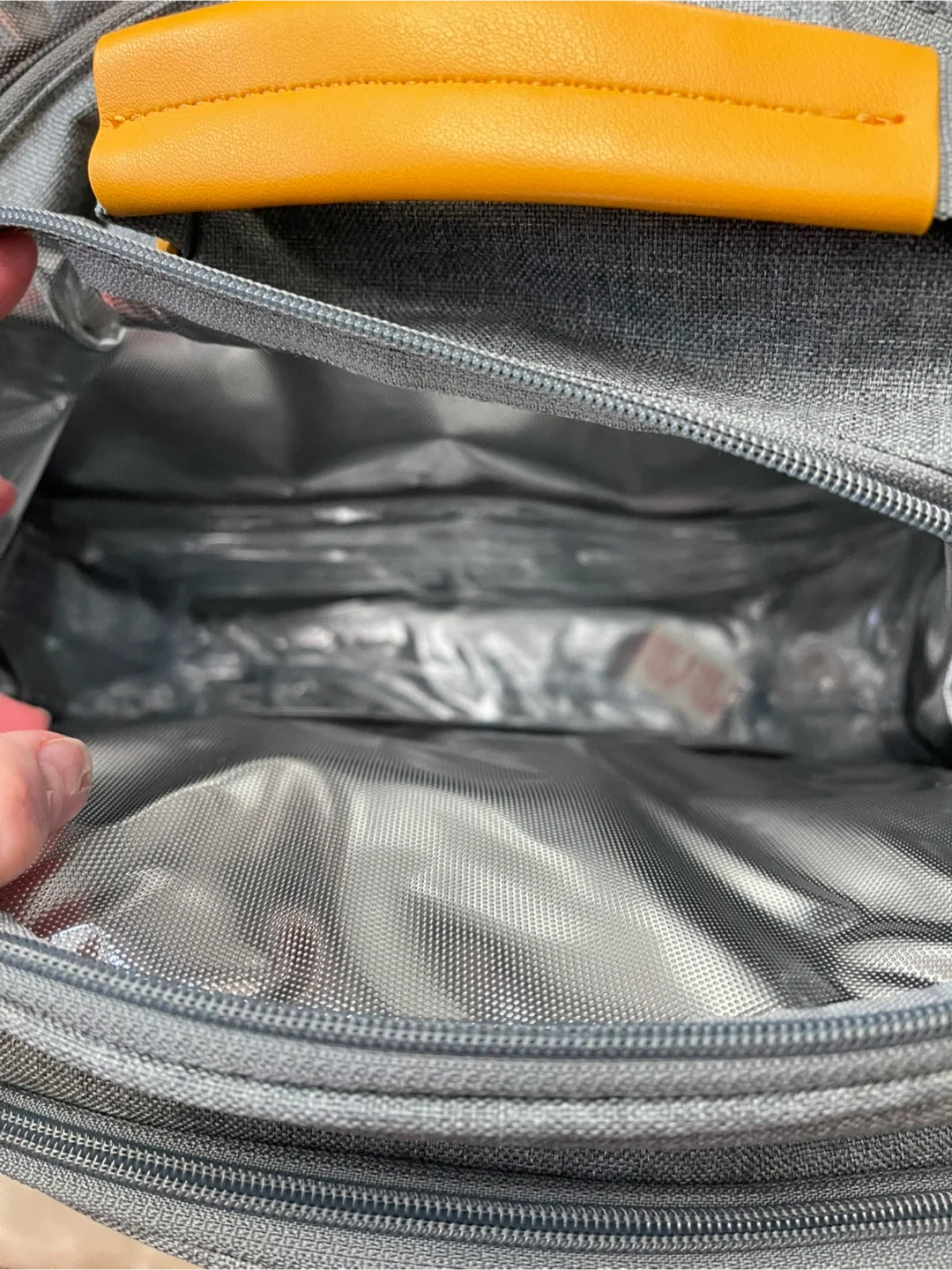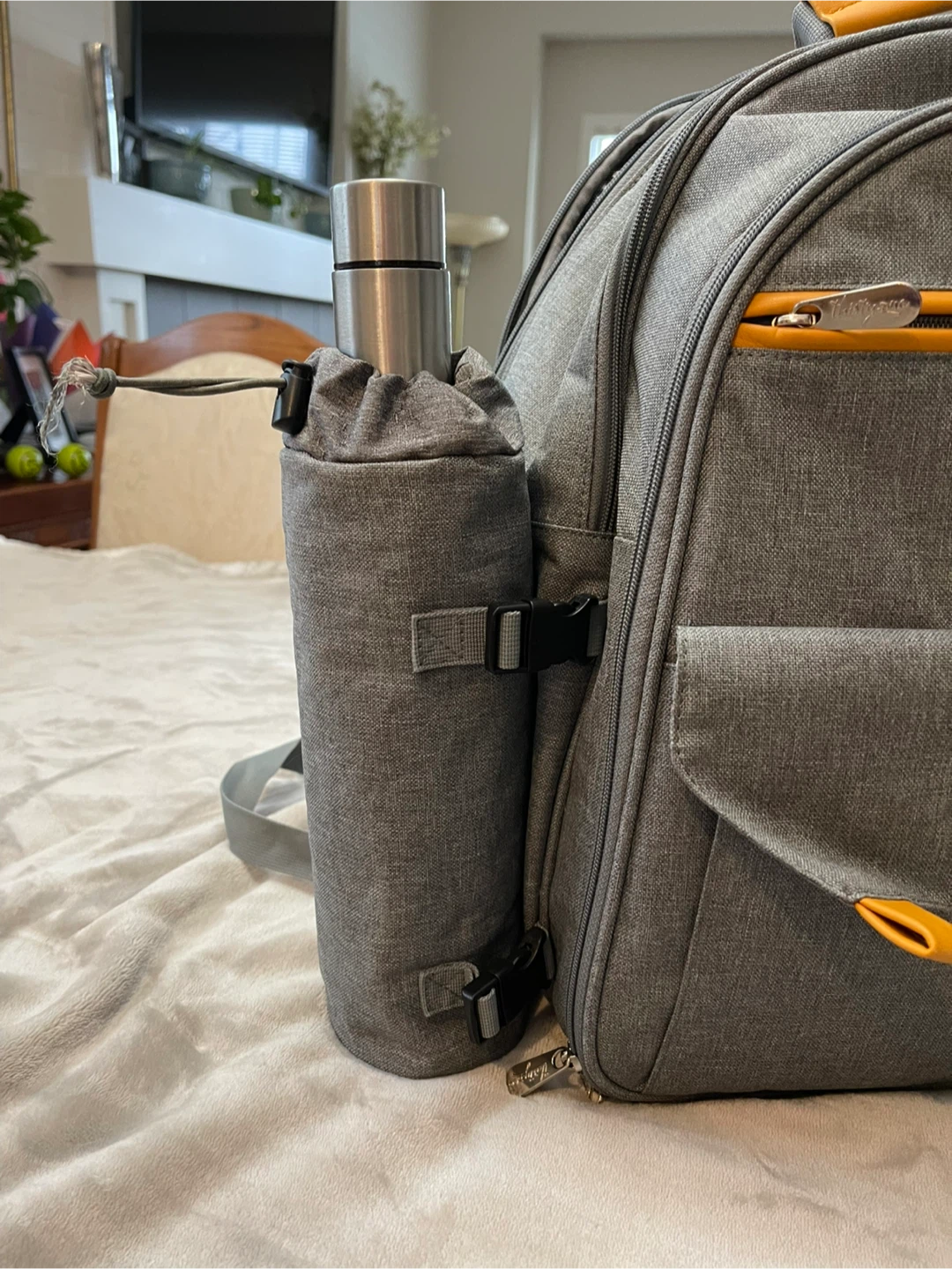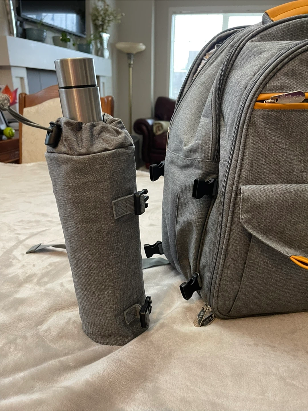 This Thirty-One picnic backpack is perfect for outdoor adventures! It comes with everything you need for a lovely picnic, including cutlery, plates, glasses, and even a blanket. The backpack is a stylish grey colour with yellow accents and has insulated compartments to keep your food and drinks at the perfect temperature.