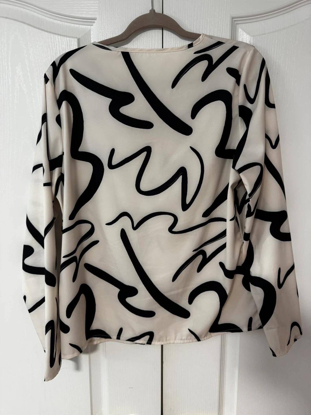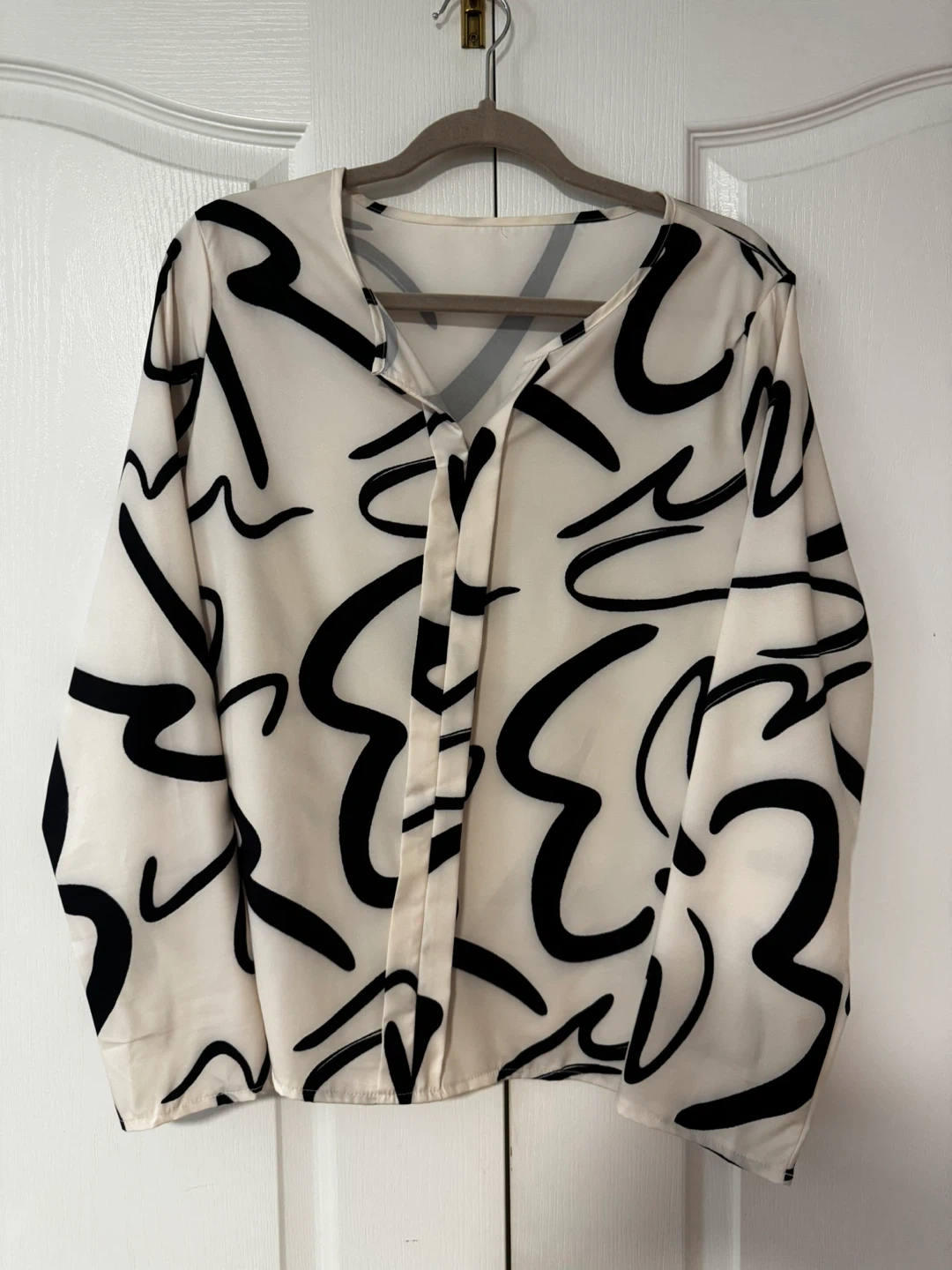 A stylish blouse featuring a cream background with a bold black pattern. Size Large. Perfect for adding a touch of flair to your wardrobe. It's in great condition and ready for a new home!
