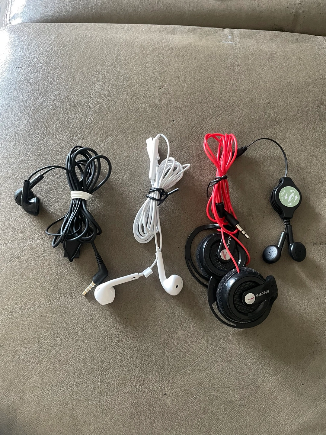 Selling 4 pairs of wired earbuds with microphone as one lot (not selling separately). Great for use with smartphones, computers, laptops, iPads, MP3 players, and more. Includes both 3.5mm jack models and Apple EarPods with Lightning connector.