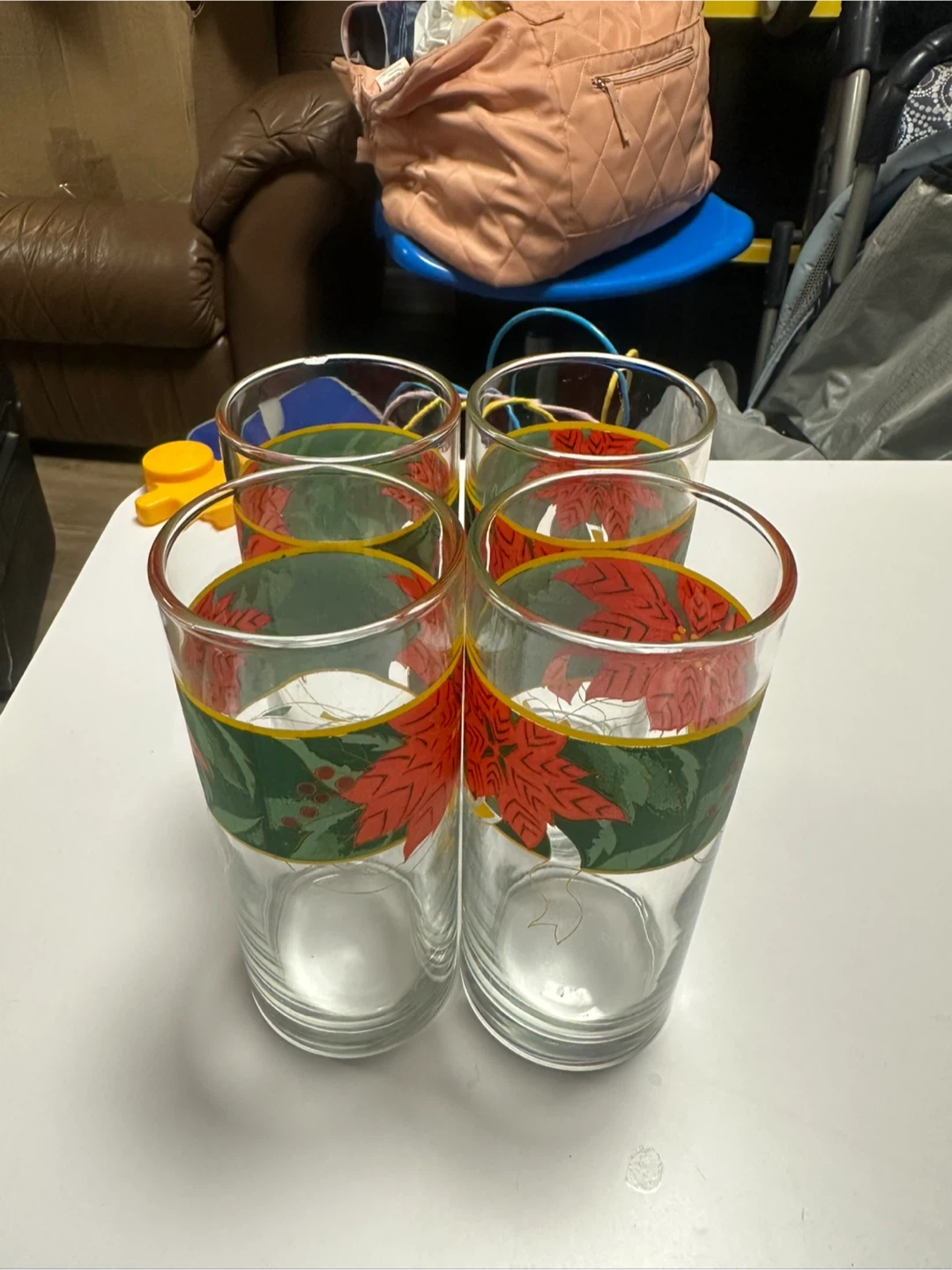 Here's a set of four drinking glasses, perfect for the holidays! They feature a festive poinsettia design with red and green accents. They're in great shape and ready to add some cheer to your table this season