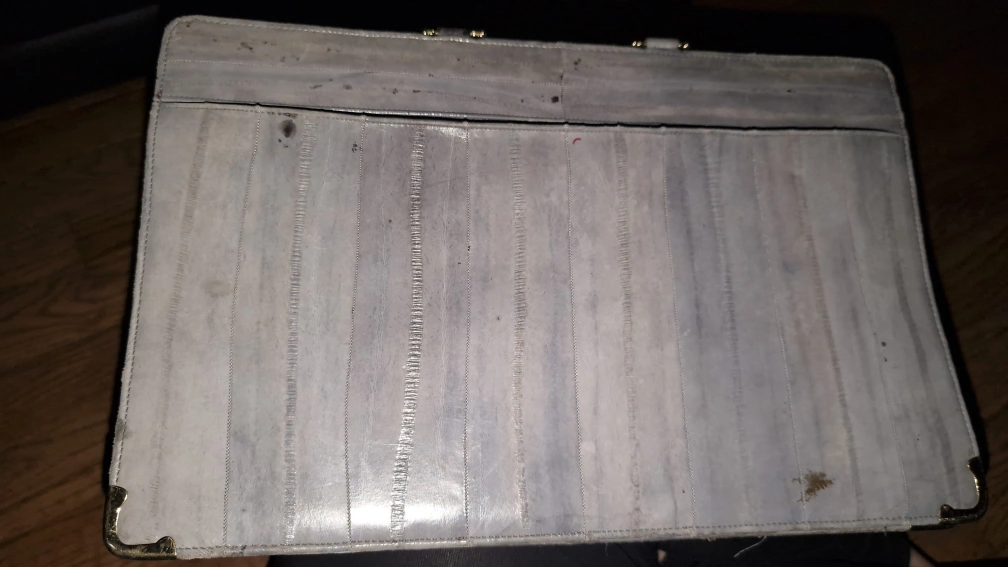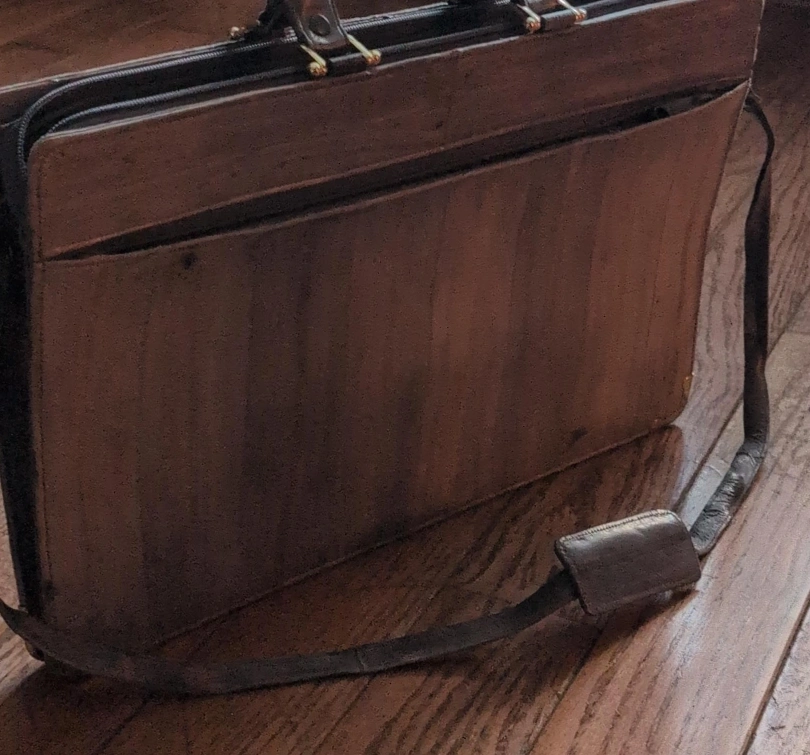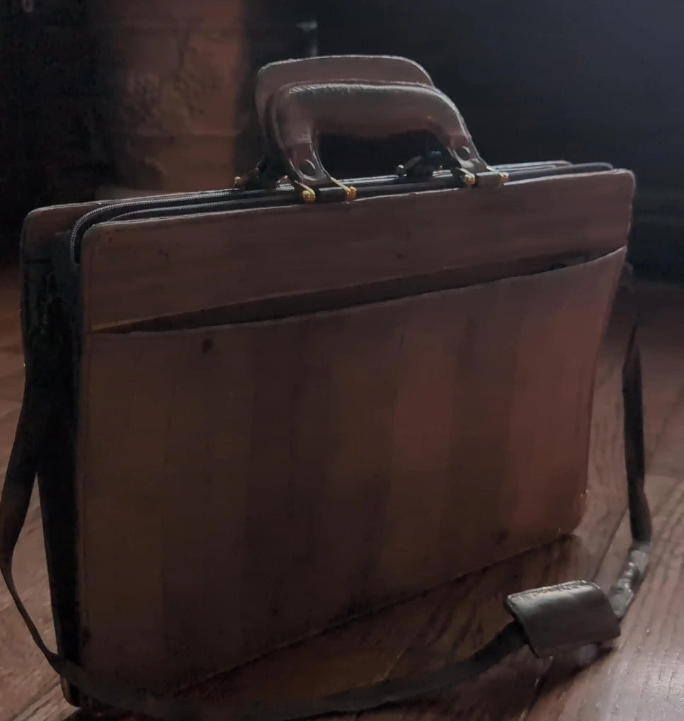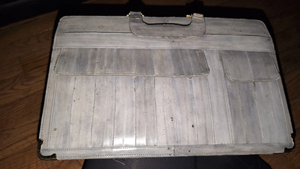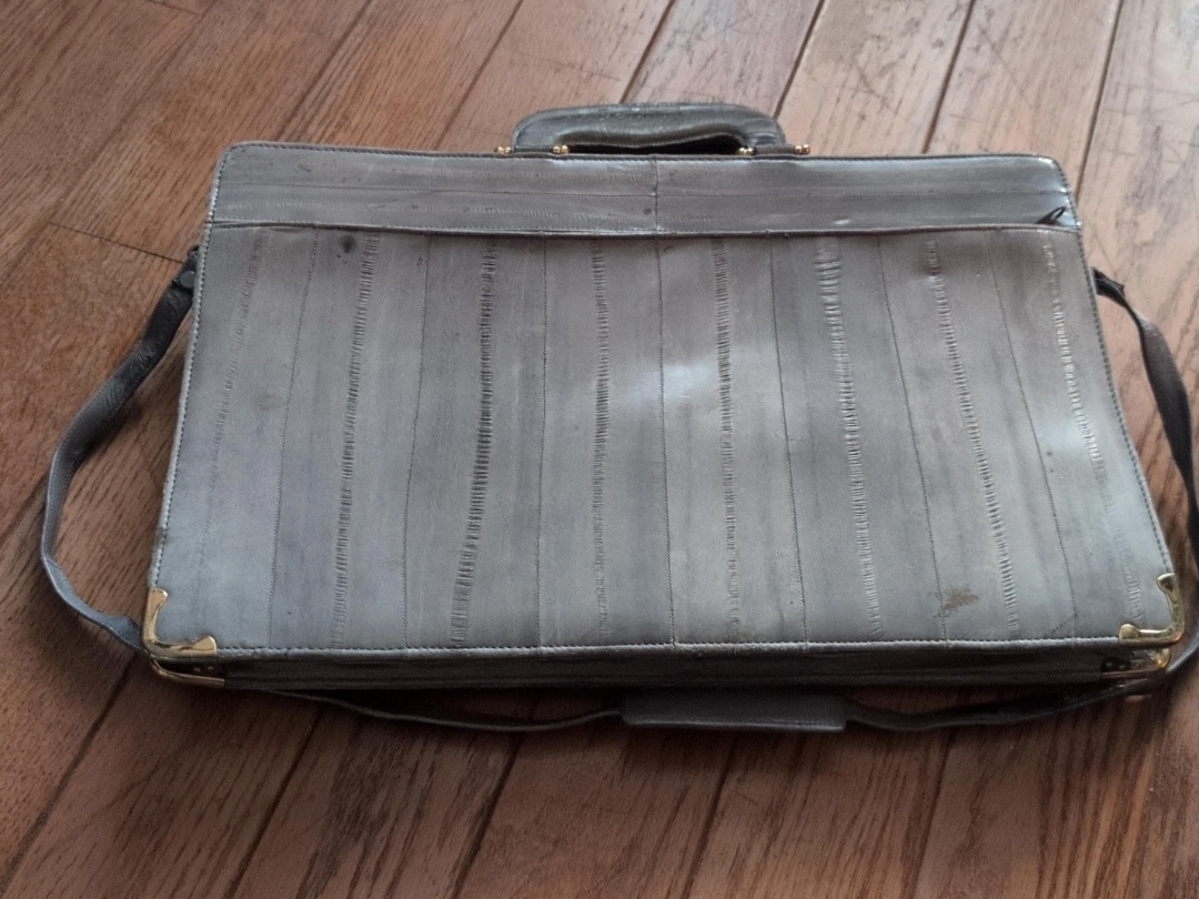 selling a unique Vintage briefcase made of eel skin leather. Has a shoulder strap and multiple interior compartments. Shows few signs of wear but still in great condition.