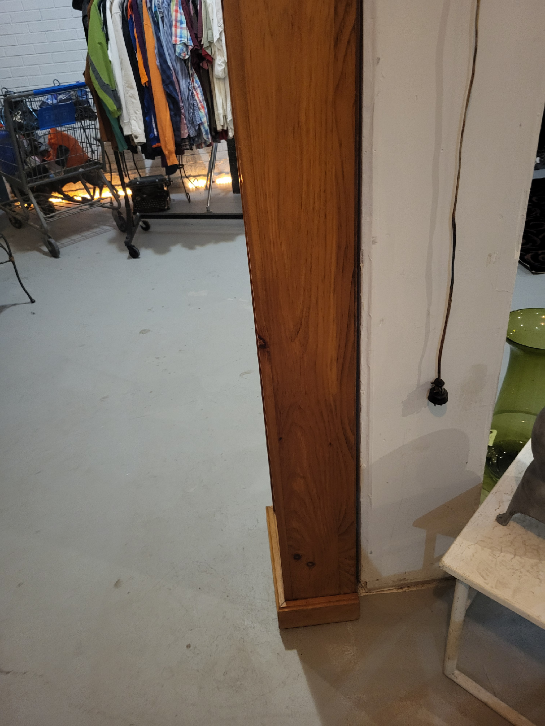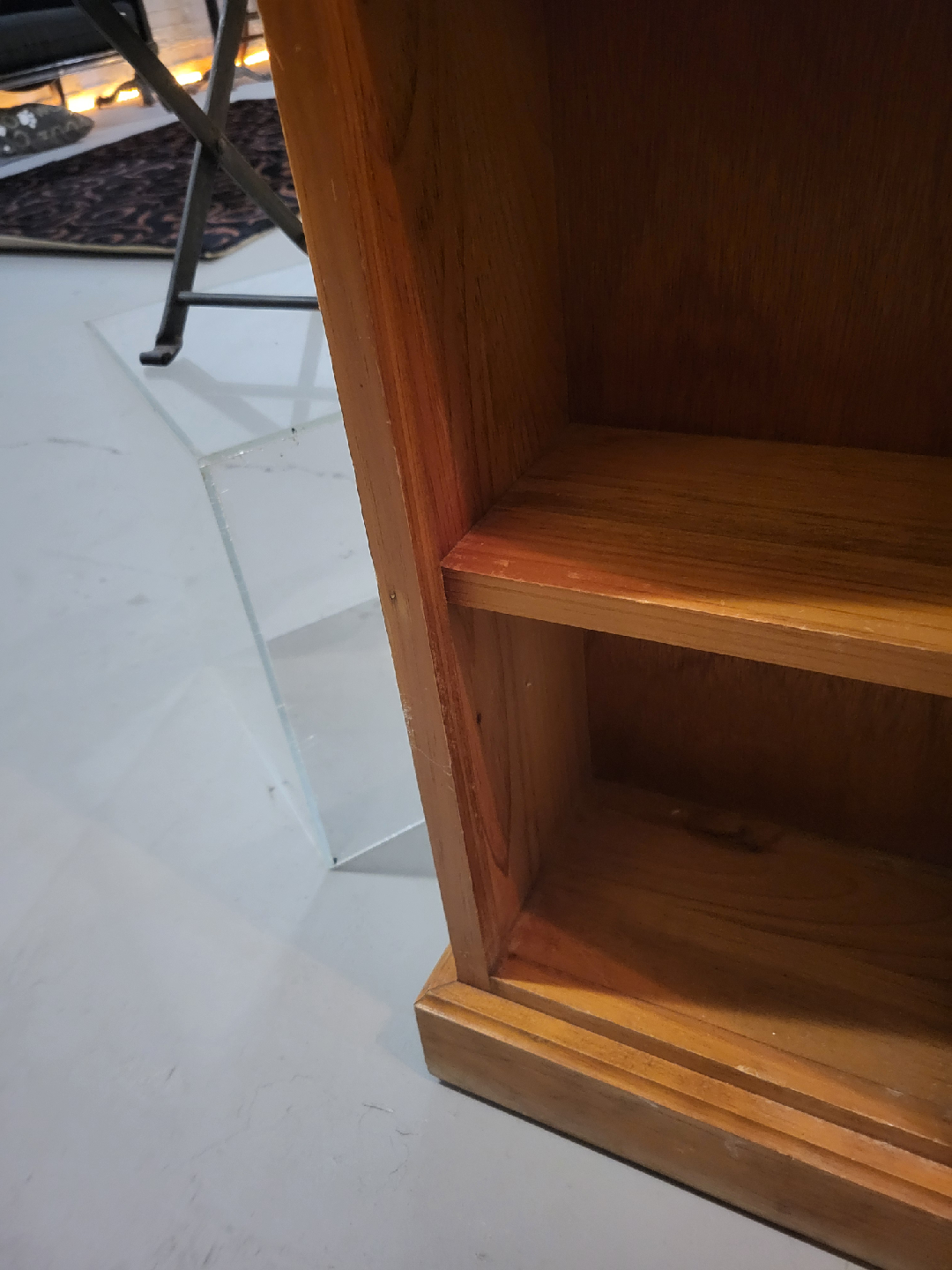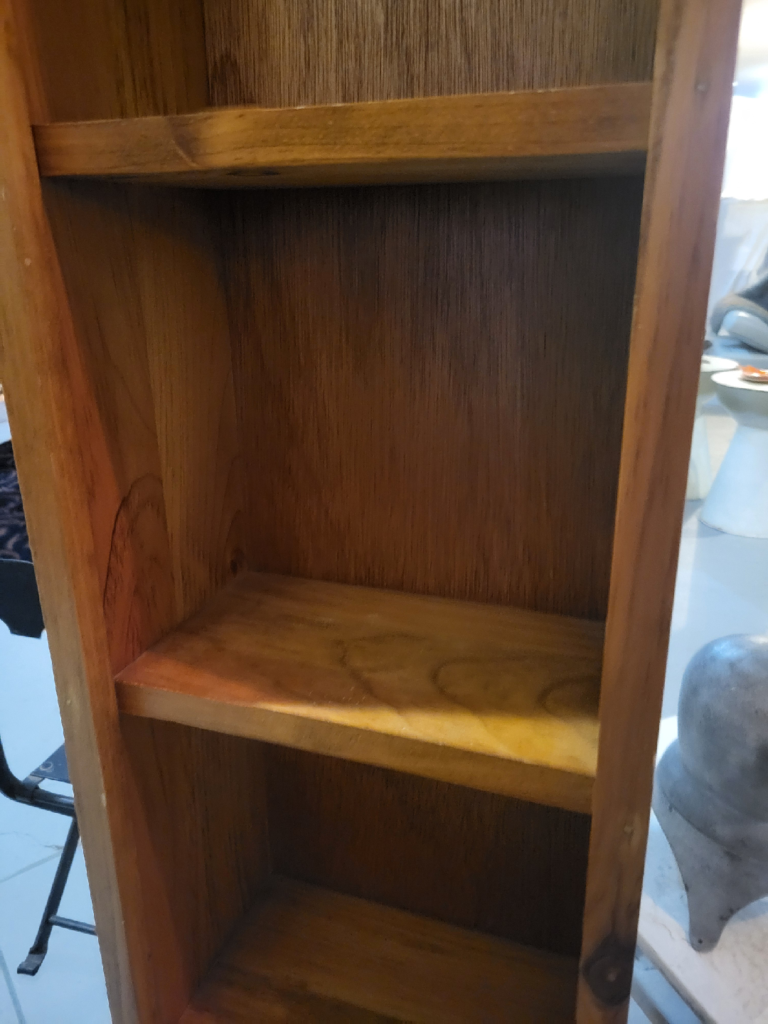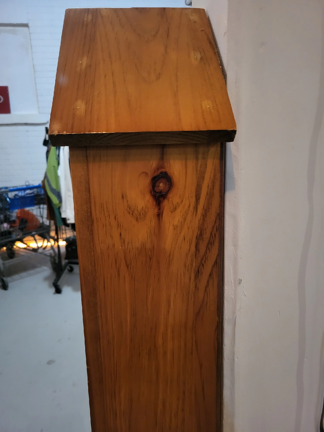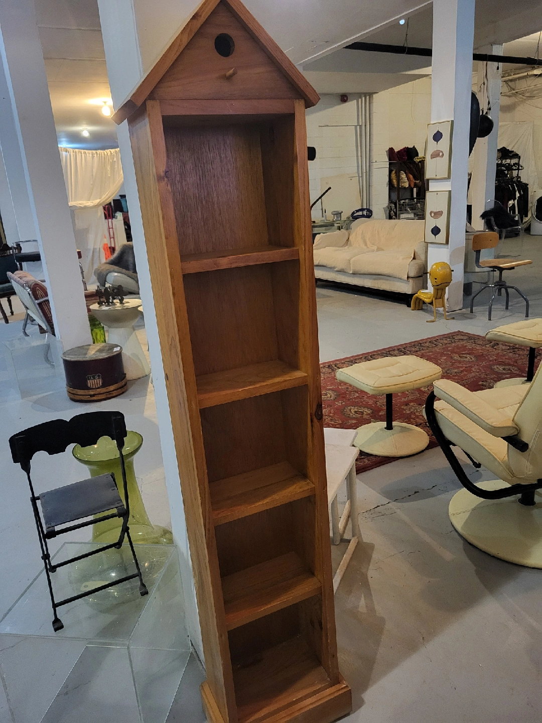 Selling a wooden display shelf. It's in great condition and would be perfect for displaying your favourite items. It features multiple shelves and a unique bird- house-shaped top. A great addition to any room!