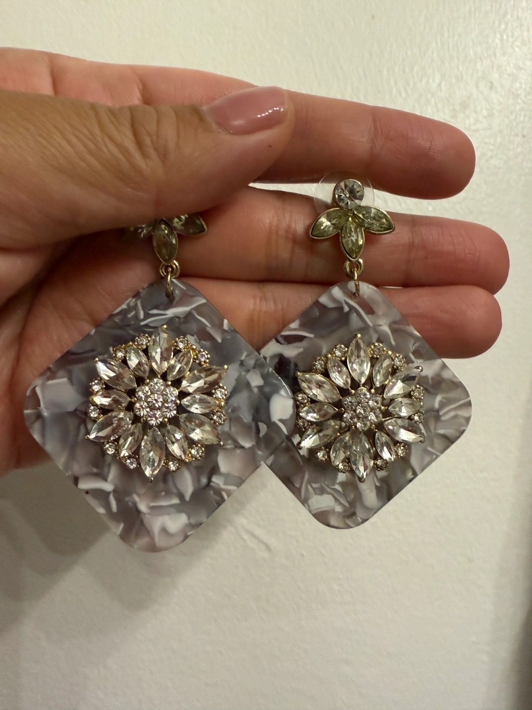 These are a pair of earrings with a grey marbled square and a crystal flower design. They are in great condition and would be a lovely addition to any outfit!