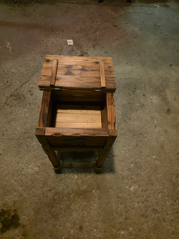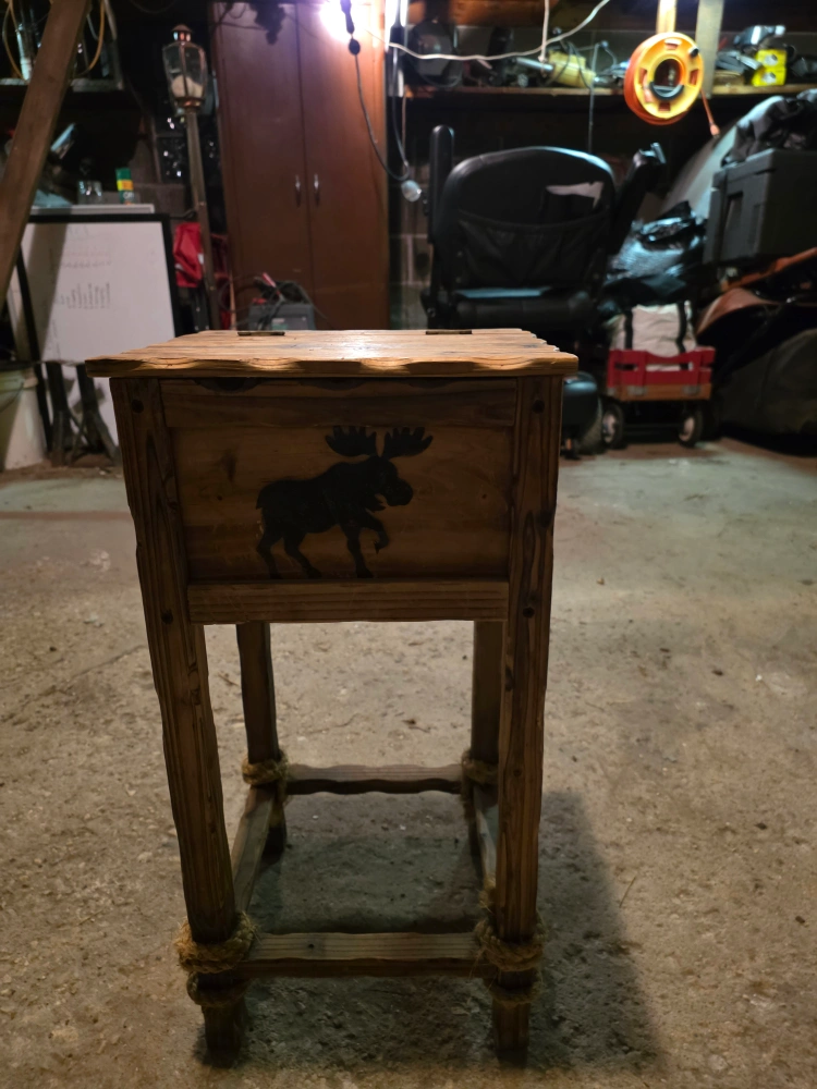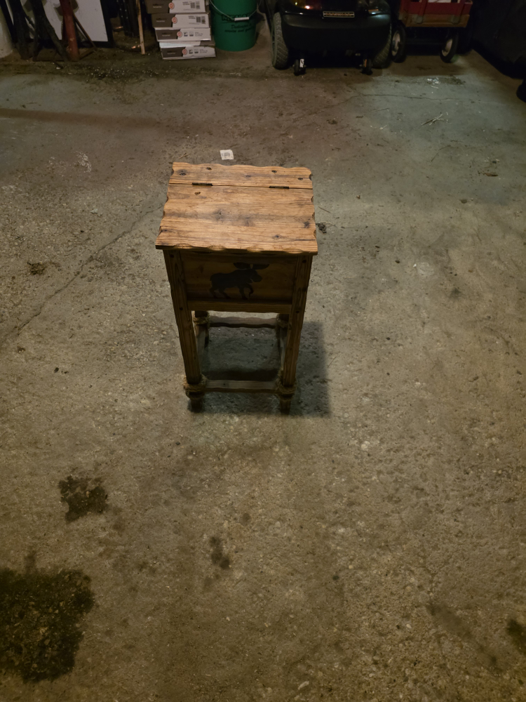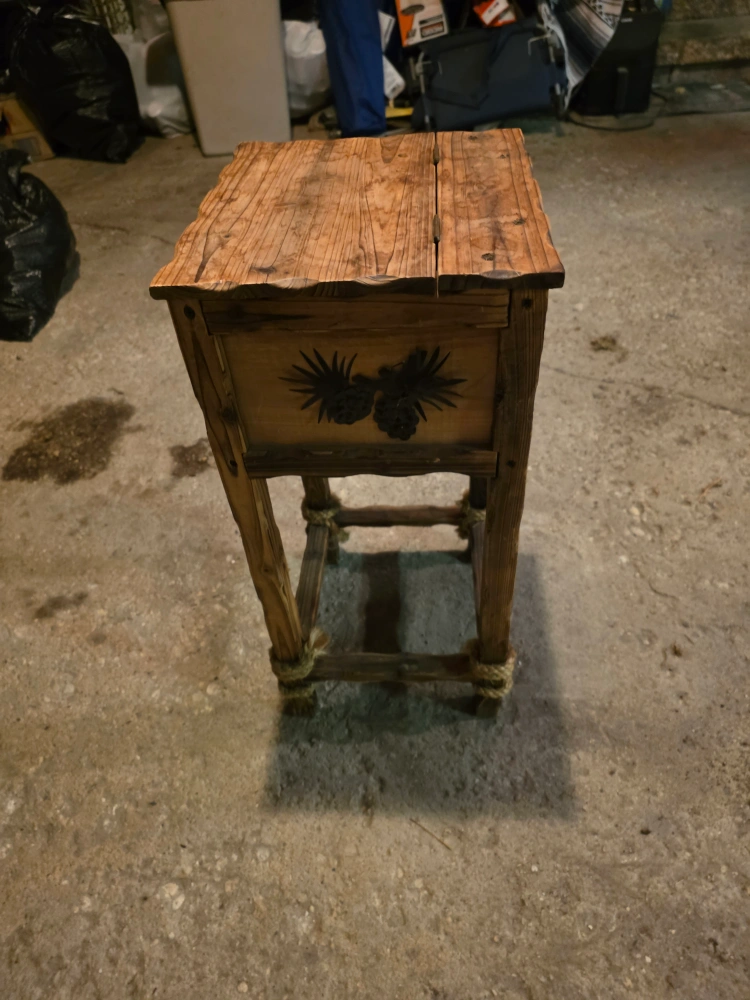 Selling a unique rustic wooden side table! This charming piece features a lift-top for storage and a decorative design. Perfect for adding a touch of country style to any room