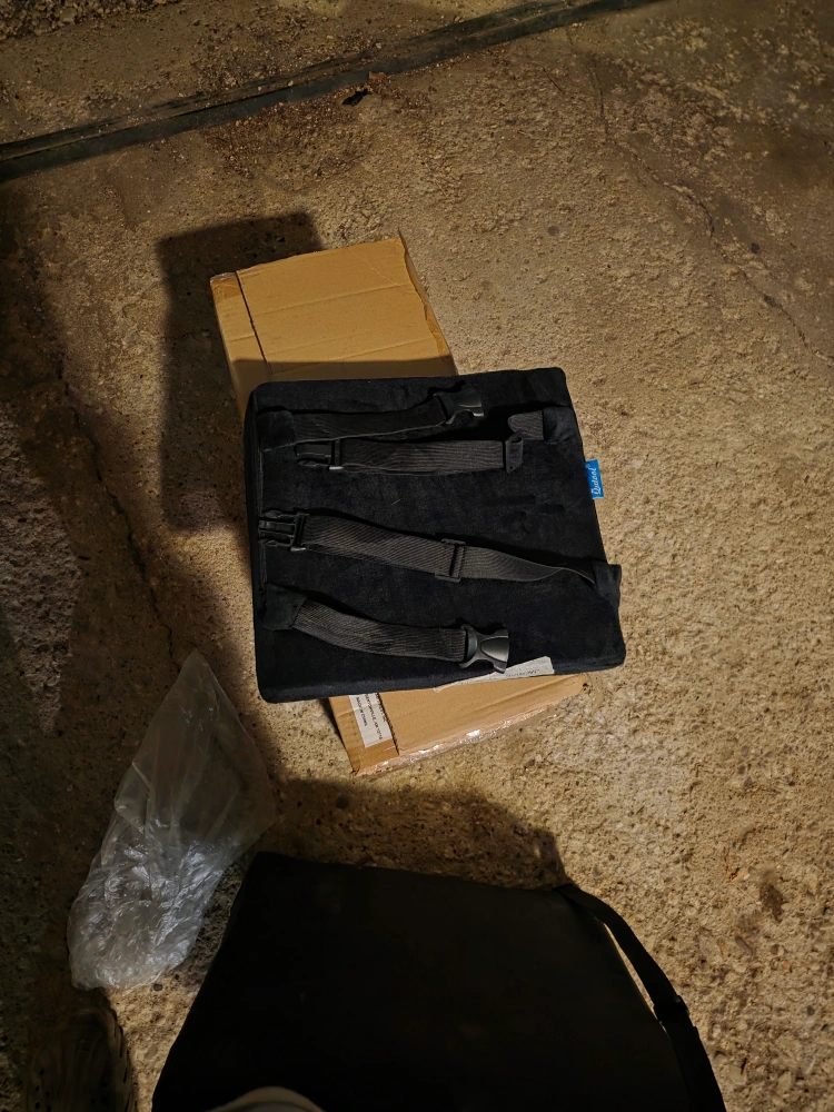 Black cushions for wheel chair. lumbar support cushion and seat cushion. Both have straps for secure attachment. Prevents slippage.