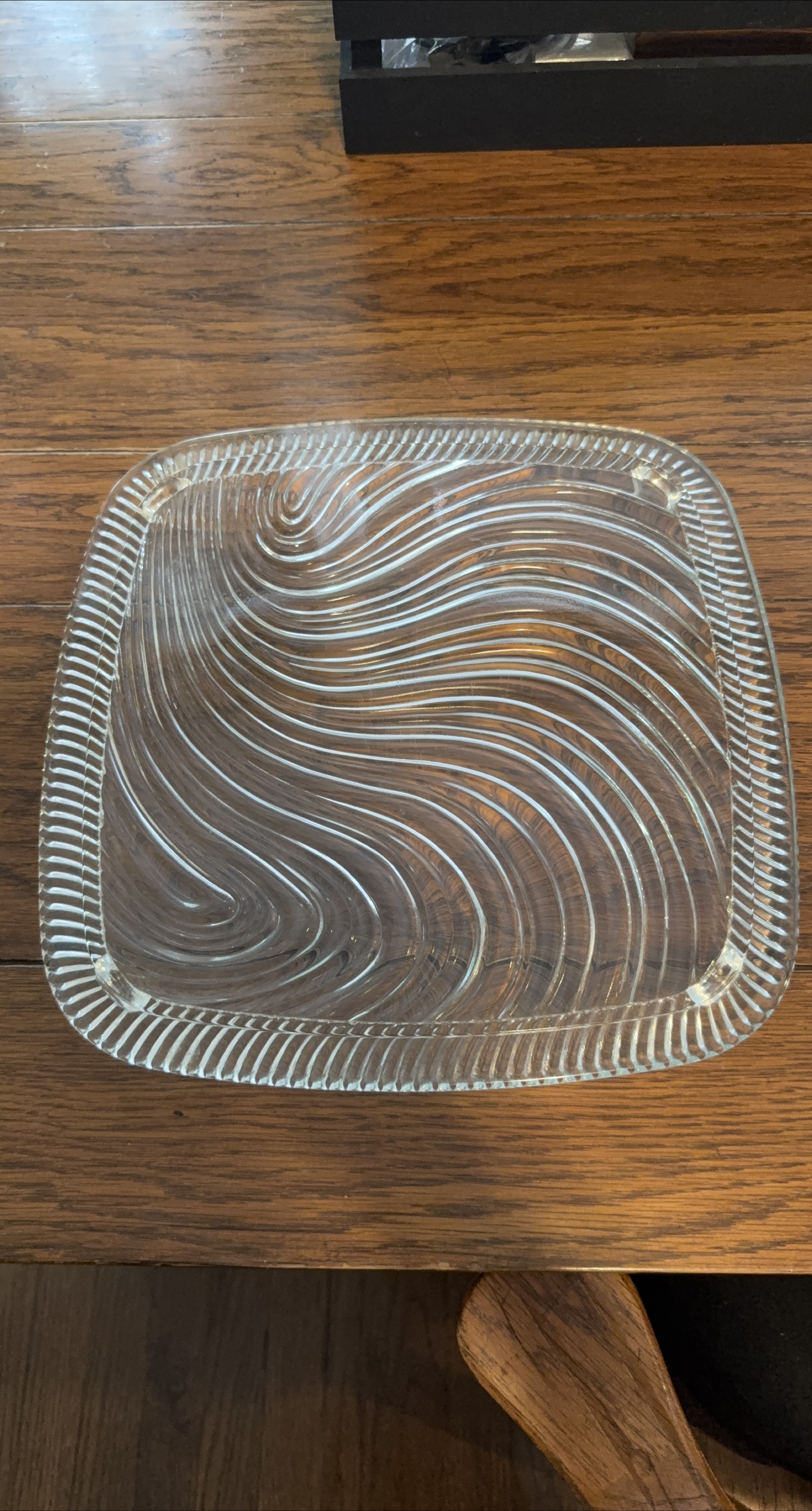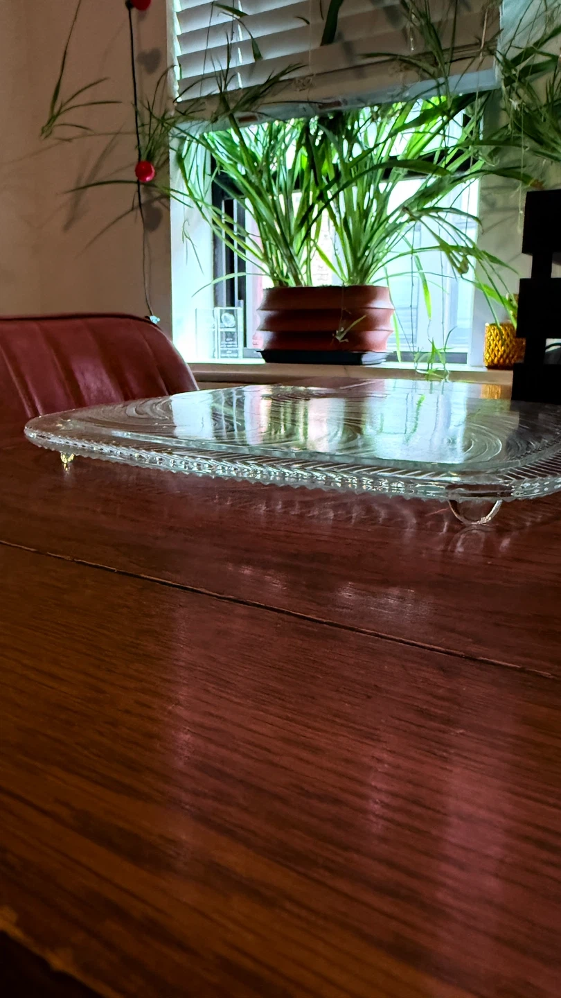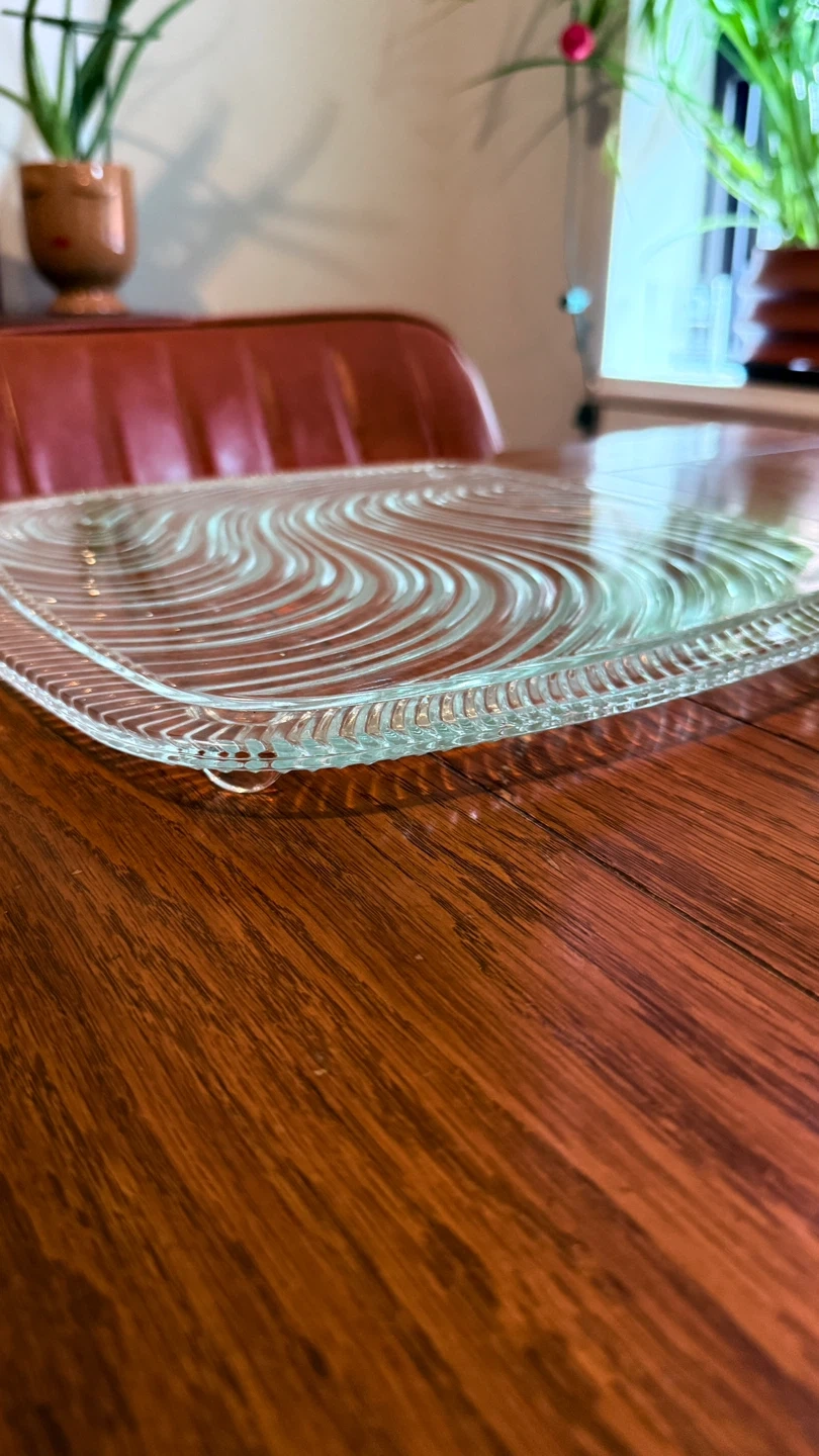 Selling a lovely glass serving platter. The platter has a unique design with wavy lines on the surface and a decorative edge. Perfect for serving appetizers, cakes or desserts at your next gathering!