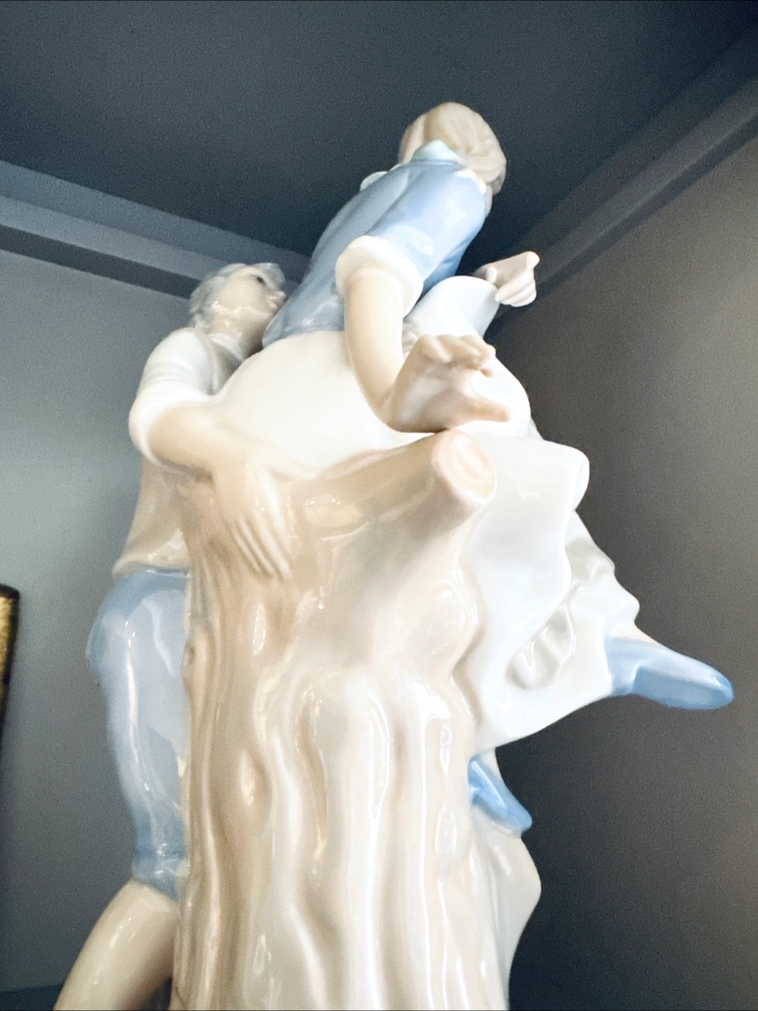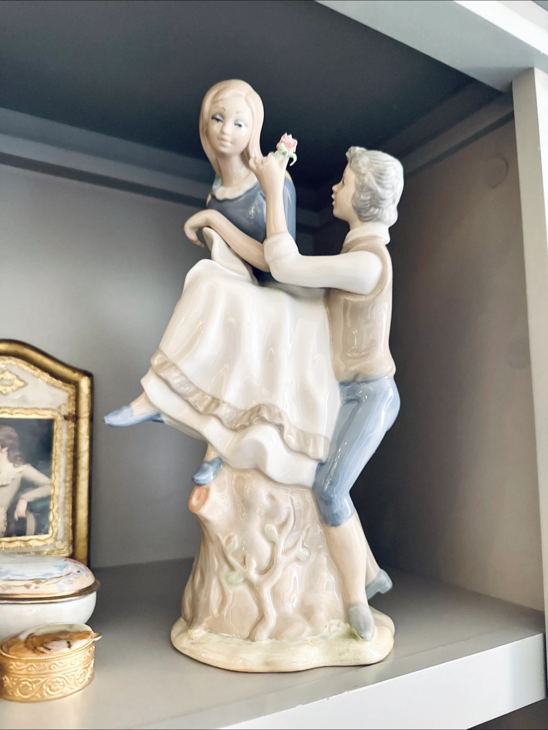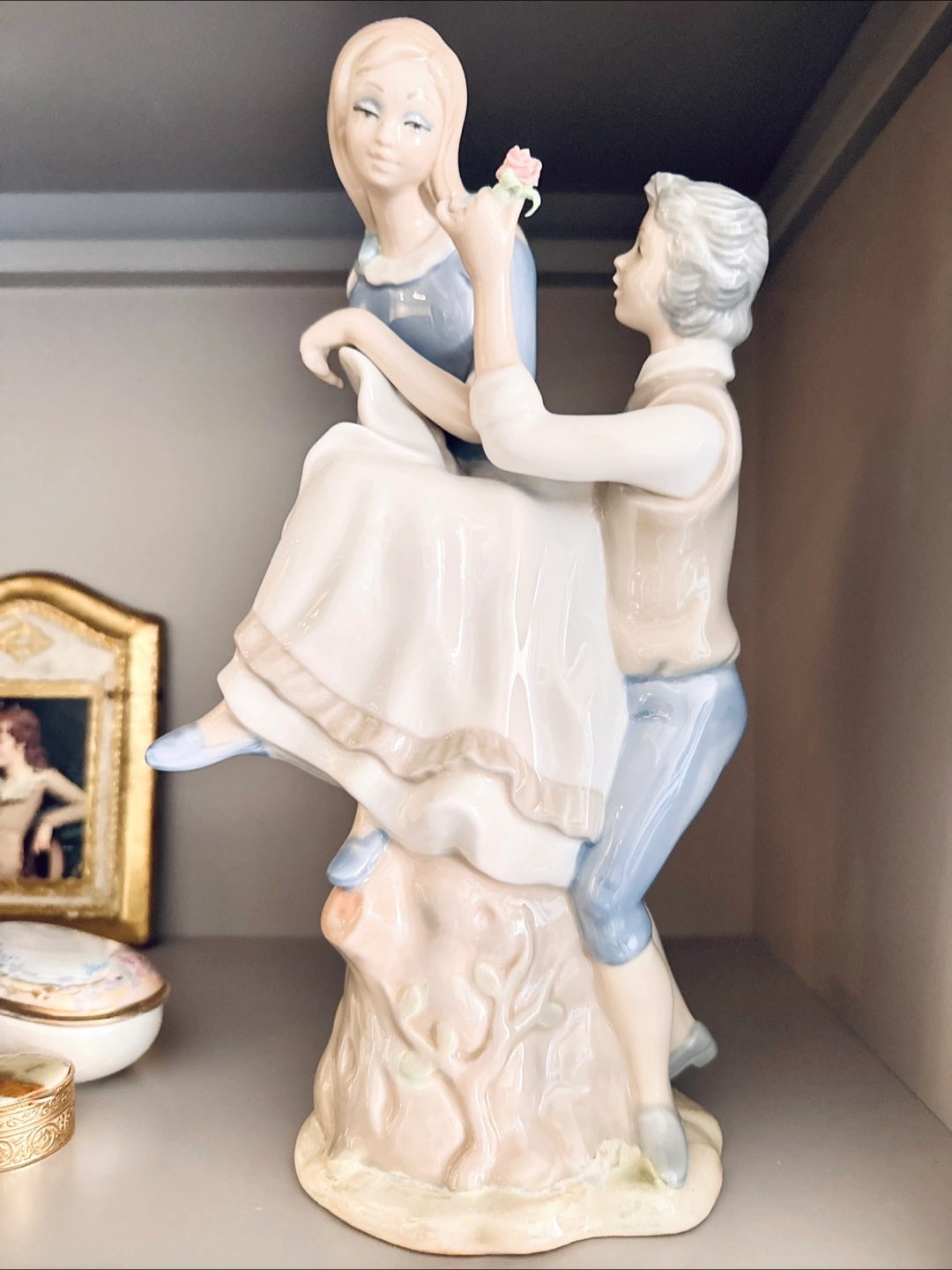 Gorgeous porcelaine gloss finish. A sweet young man handing a rose to the young woman. So much detail, 360 degrees around. Delicate hands and facial features.