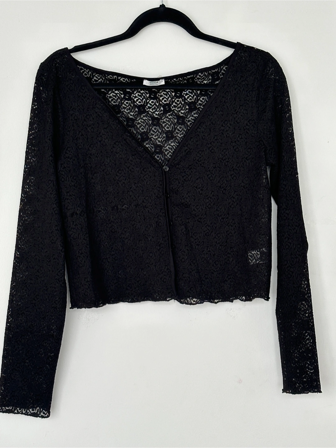 Black lace cardigan, It's in great condition and features a delicate lace pattern.