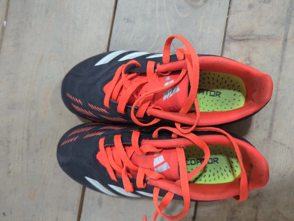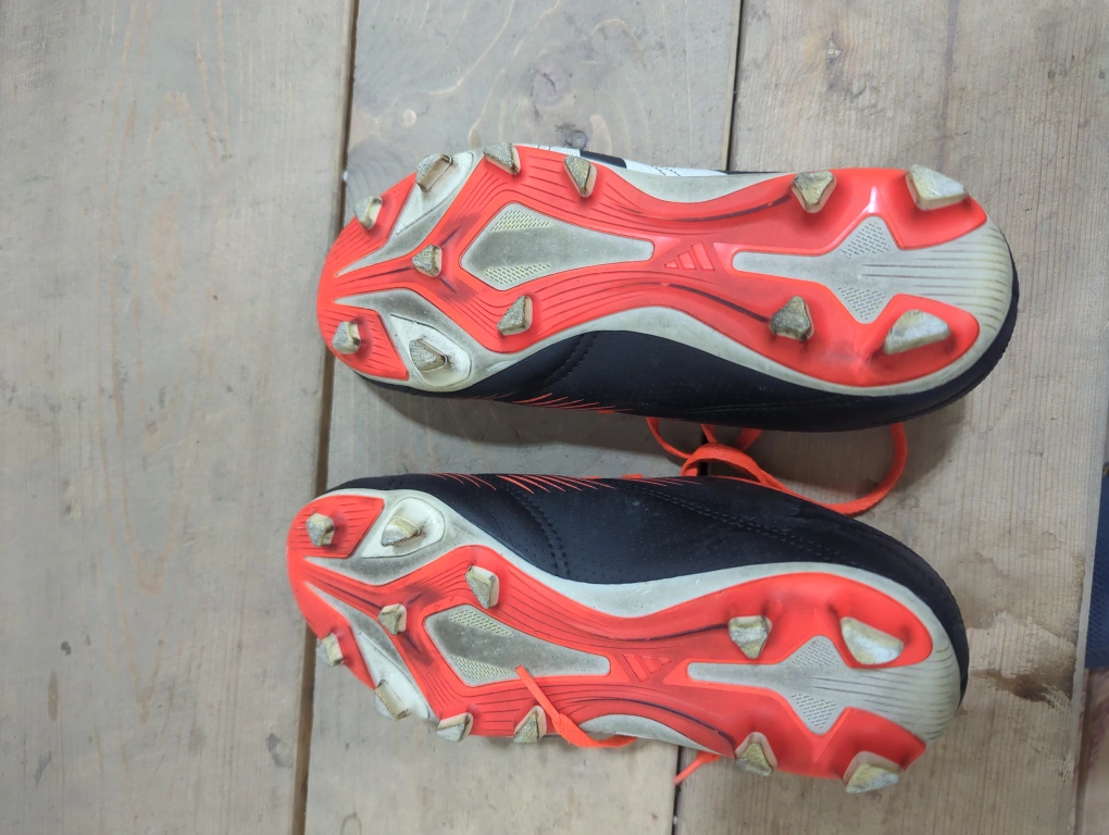 Selling a pair of Adidas Predator soccer cleats. They are black with white stripes and orange accents. The cleats show some signs of use, but are still in good condition for playing. Great for the soccer enthusiast! Size 1 US
