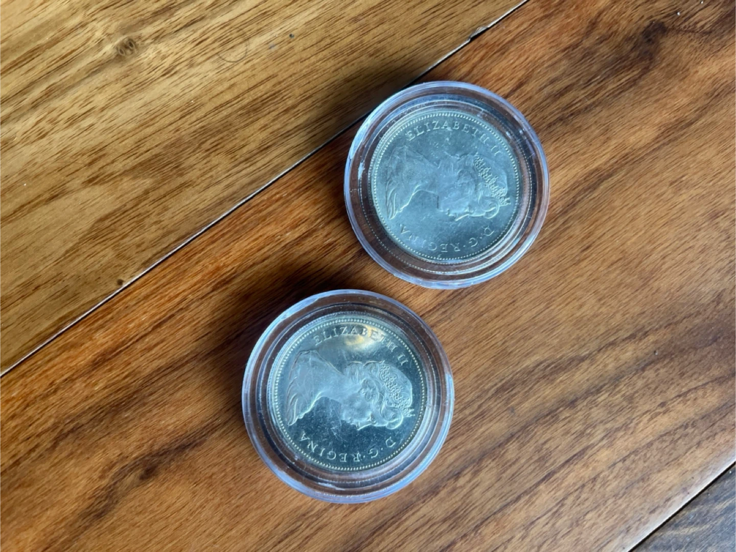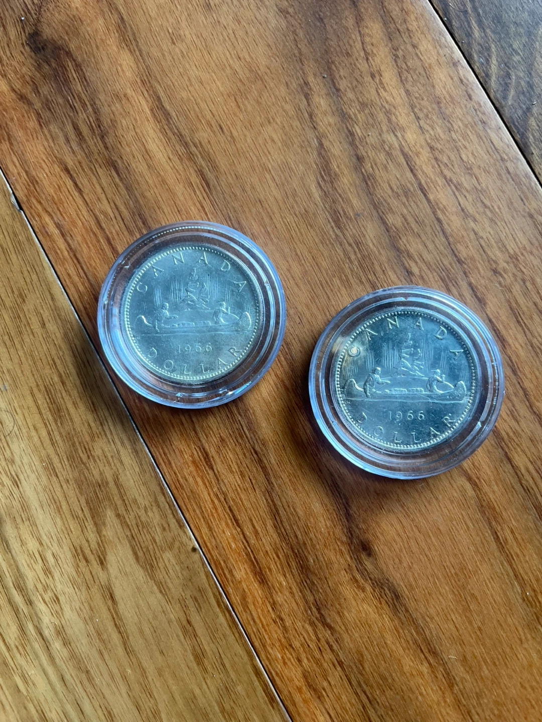 Selling 2 1966 Canadian silver dollar. It features Queen Elizabeth II on one side and voyageurs in a canoe on the other. A great piece for collectors!
