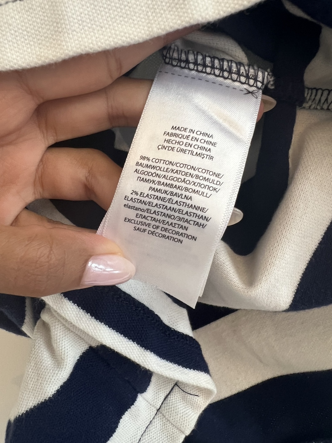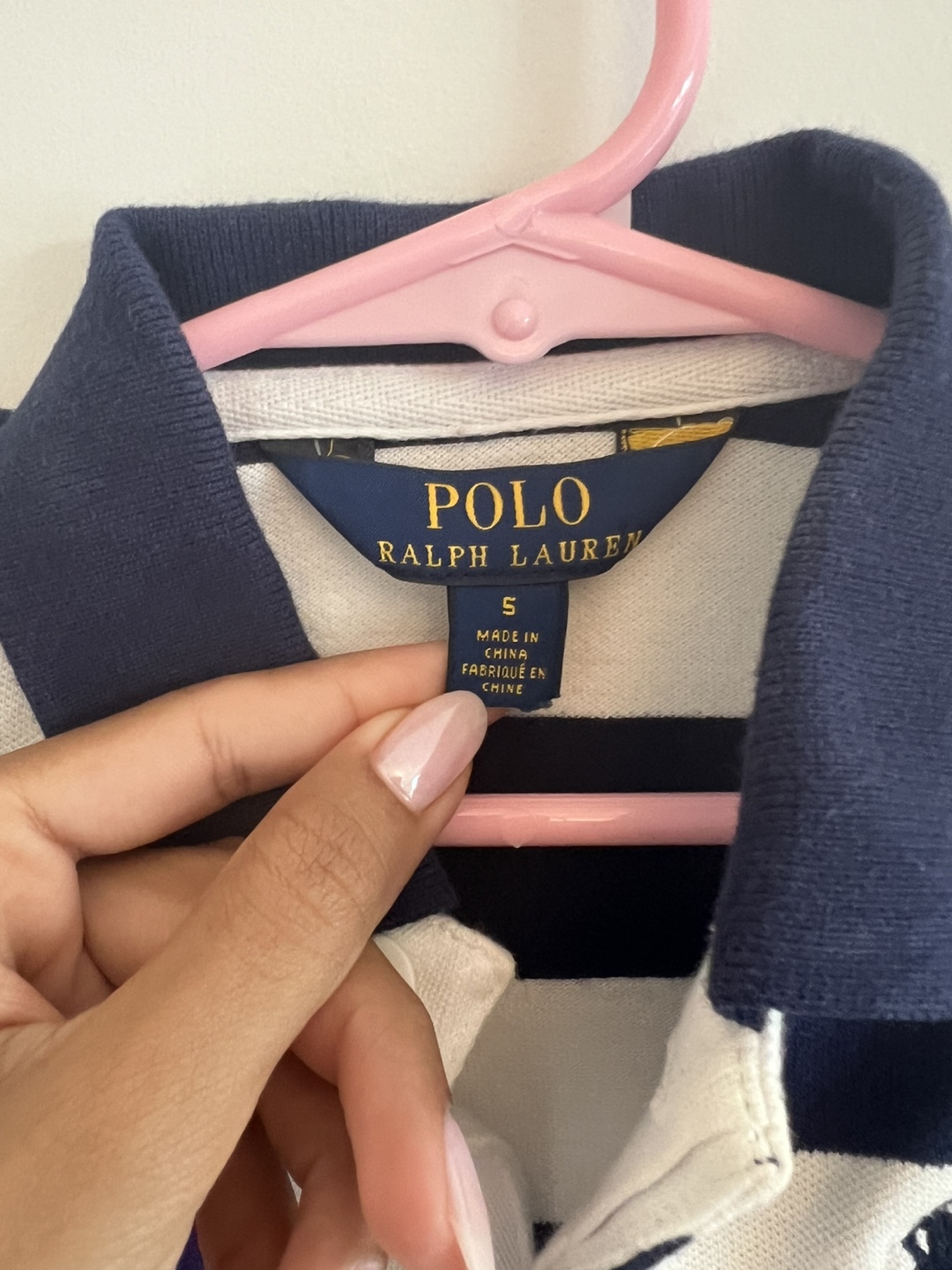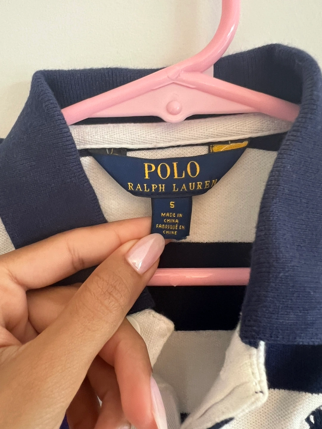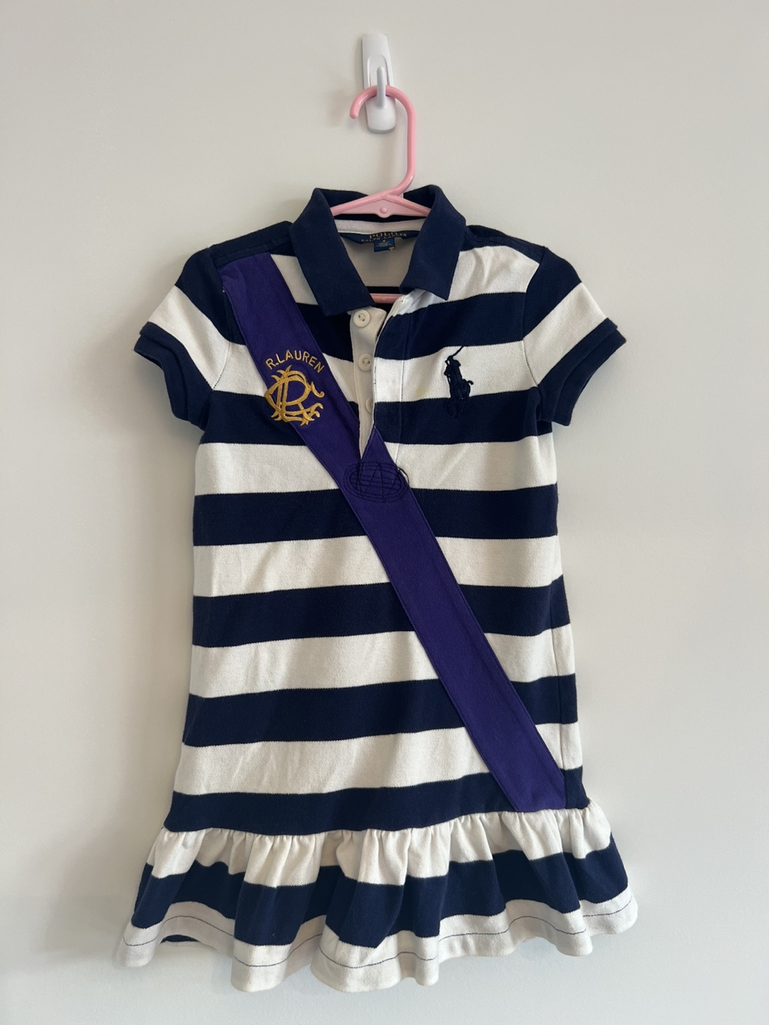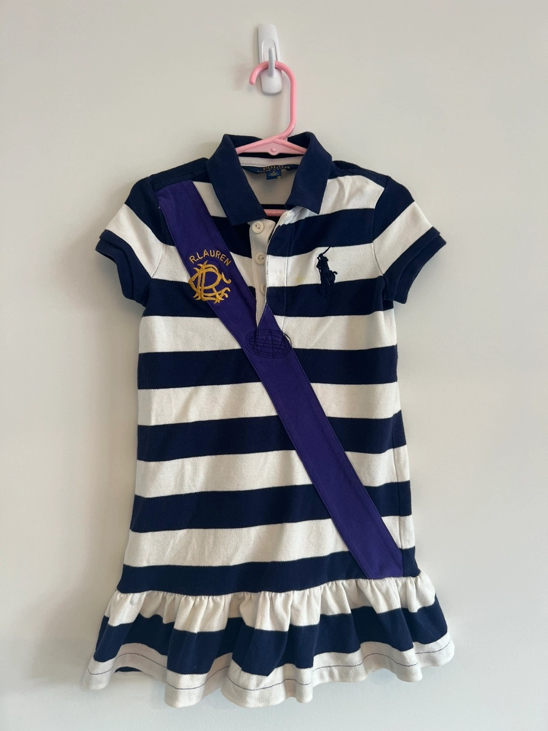 A cute Ralph Lauren dress for girls in size 5! The dress is striped in navy and white, with a purple sash. It's made of 98% cotton and 2% elastane, so it's comfy and has a bit of stretch