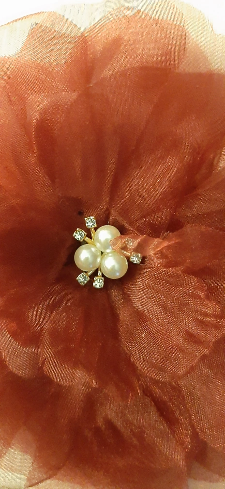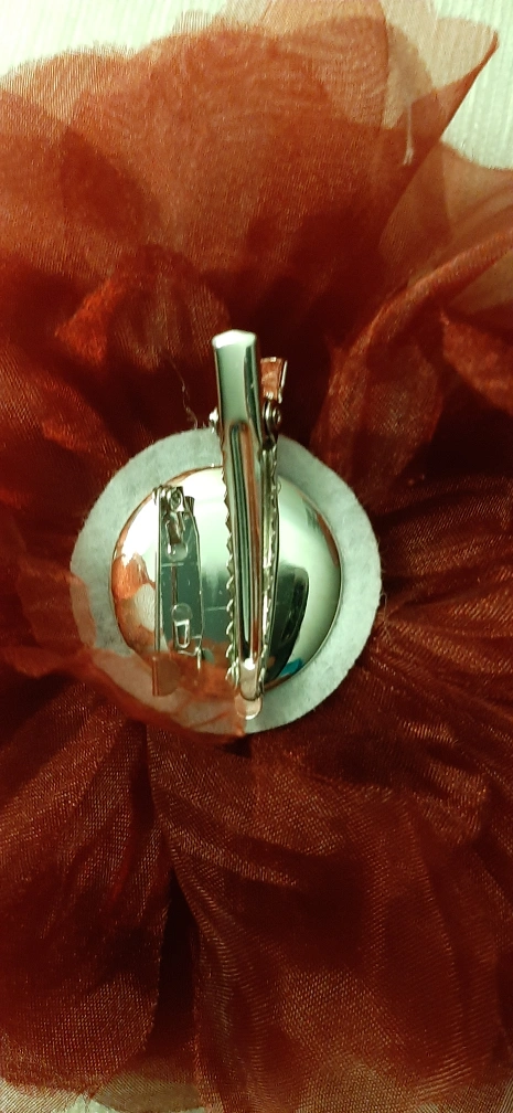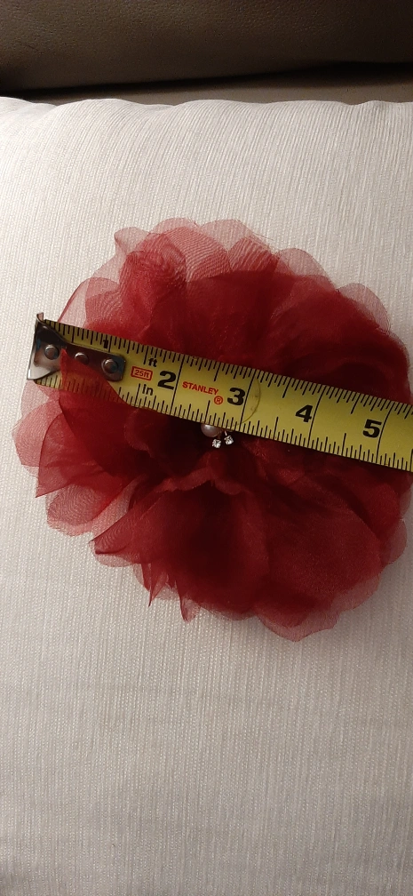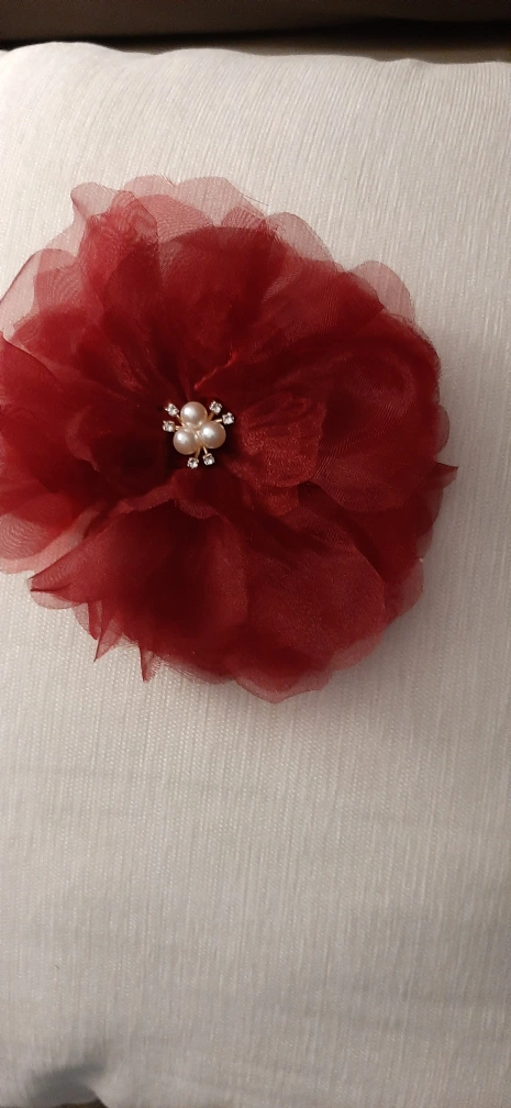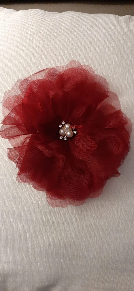 This is a burgundy flower hair clip. It measures approximately 4.5 inches in diameter. It has a pearl and rhinestone embellishment in the center. It has an alligator clip on the back.