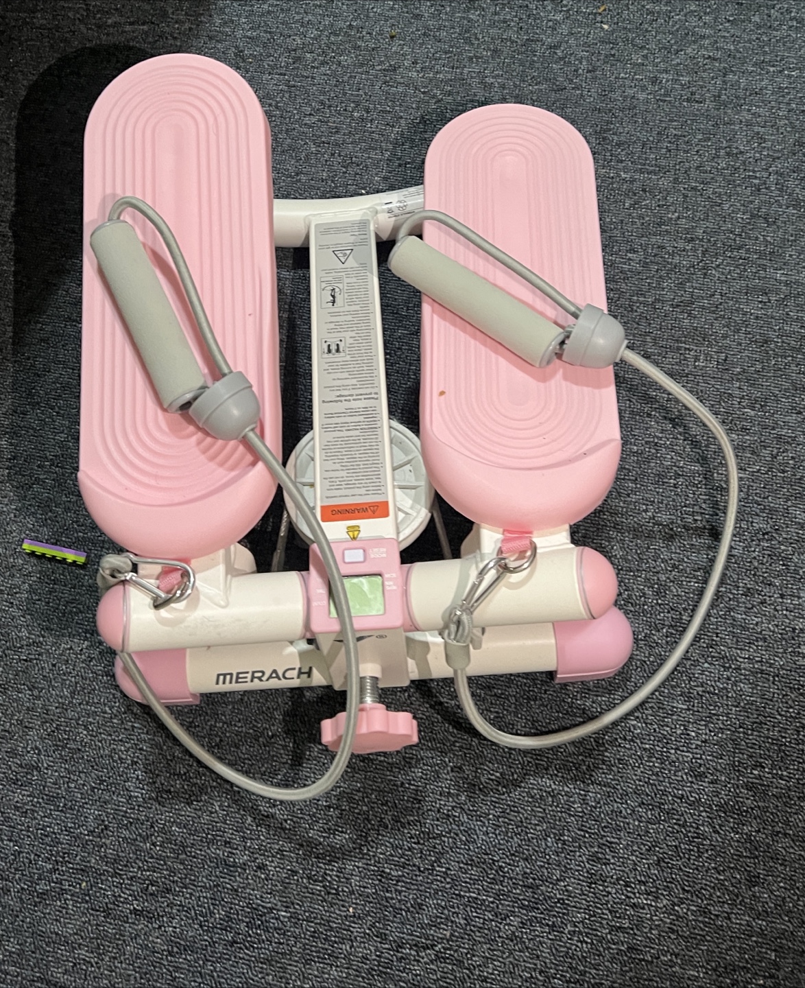 I'm selling a pink Merach mini stepper! It's in great condition and perfect for a quick workout at home. It comes with resistance bands to add some arm exercises to your routine. This compact stepper is lightweight and easy to store when you're not using it