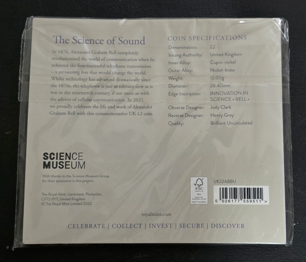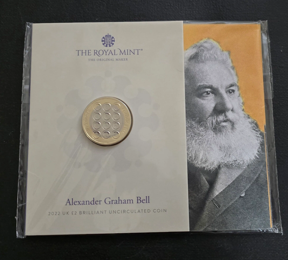 Commemorative UK £2 coin celebrating Alexander Graham Bell and his contributions to the world of communication. This brilliant uncirculated coin comes in its original packaging from The Royal Mint. A great piece for collectors!