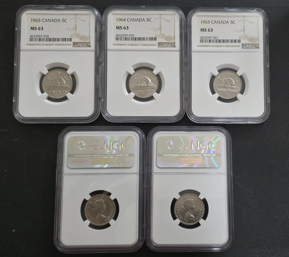 Selling a collection of Canadian 5 cent coins from 1963 and 1964. They've been graded MS 63 by the Numismatic Guaranty Corporation (NGC). A great addition to any coin collection!