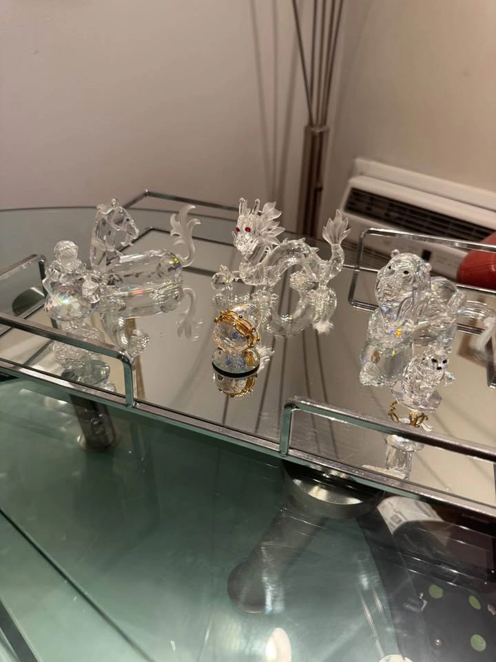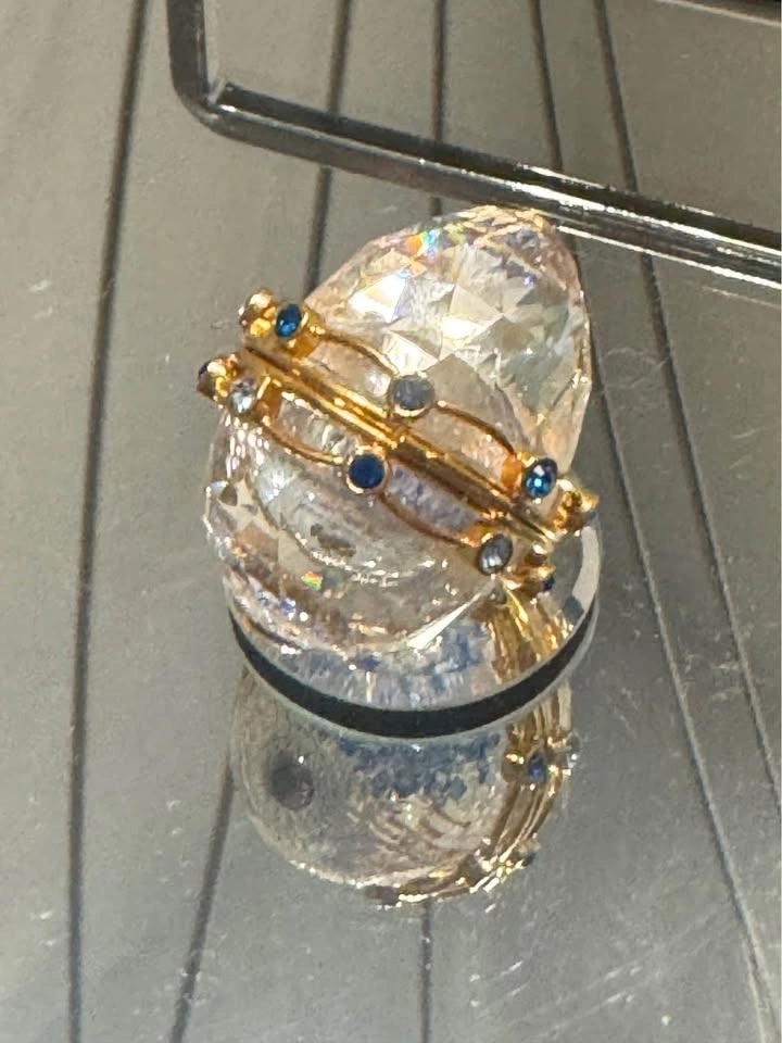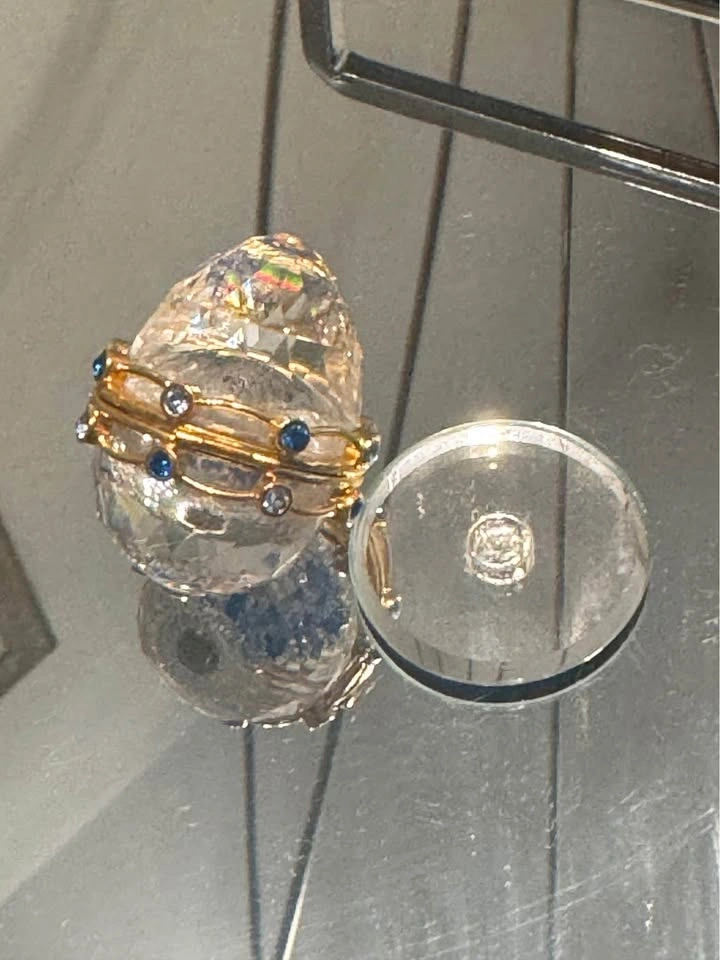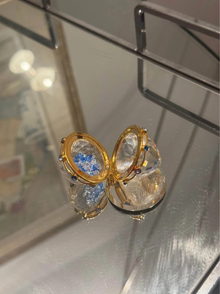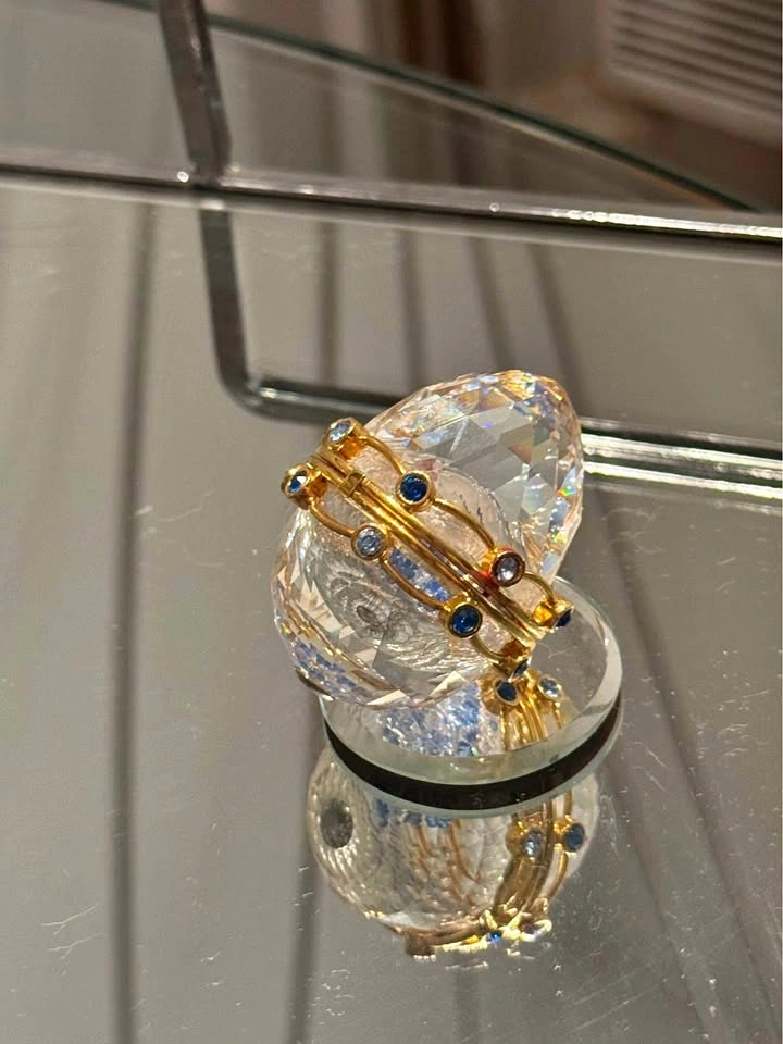 Beautiful and rare Swarovski Crystal Memories Fabergé Style Egg. This faceted crystal egg features 22k gold-plated trim, accented with colored crystal “gemstones.” The egg opens to reveal a cluster of tiny faceted blue crystal beads inside, a signature Swarovski detail. • Authentic Swarovski (retired collectible) • Faceted crystal with gold-plated trim • Accented with multicolor stones • Approx. 2.25” tall • Condition: Excellent – no chips, cracks, or repairs. No original box included. ✨ A rare and luxurious Swarovski collectible, perfect for Fabergé lovers and Swarovski enthusiasts alike.