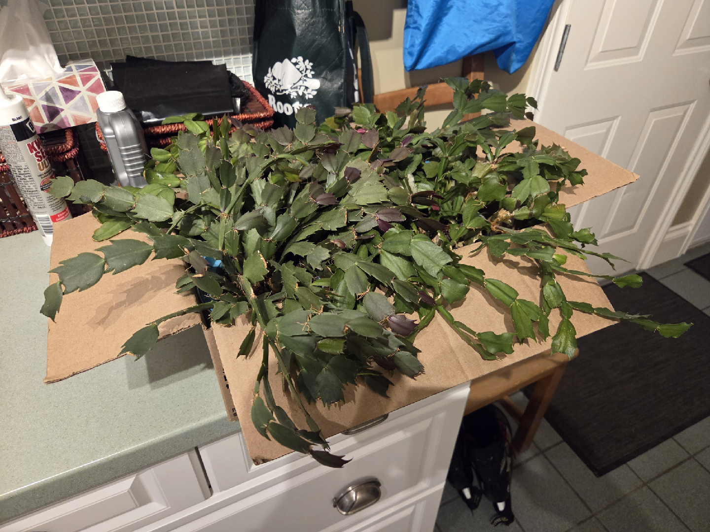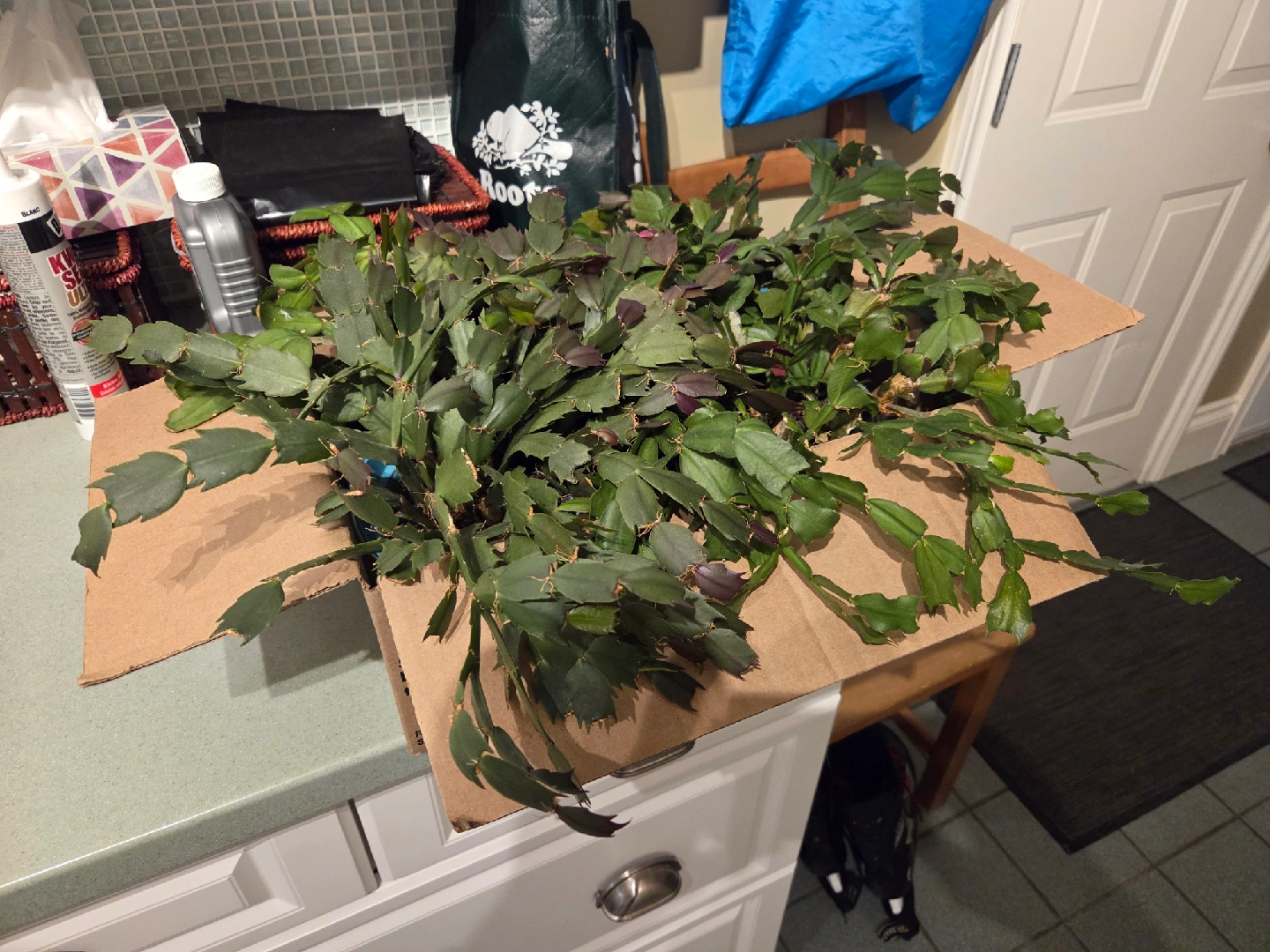 4 beautiful Christmas Cactus plant! It's currently in a cardboard box, ready for a new home. The plant has lush green leaves and some reddish-purple tinges, making it a lovely addition to any indoor space