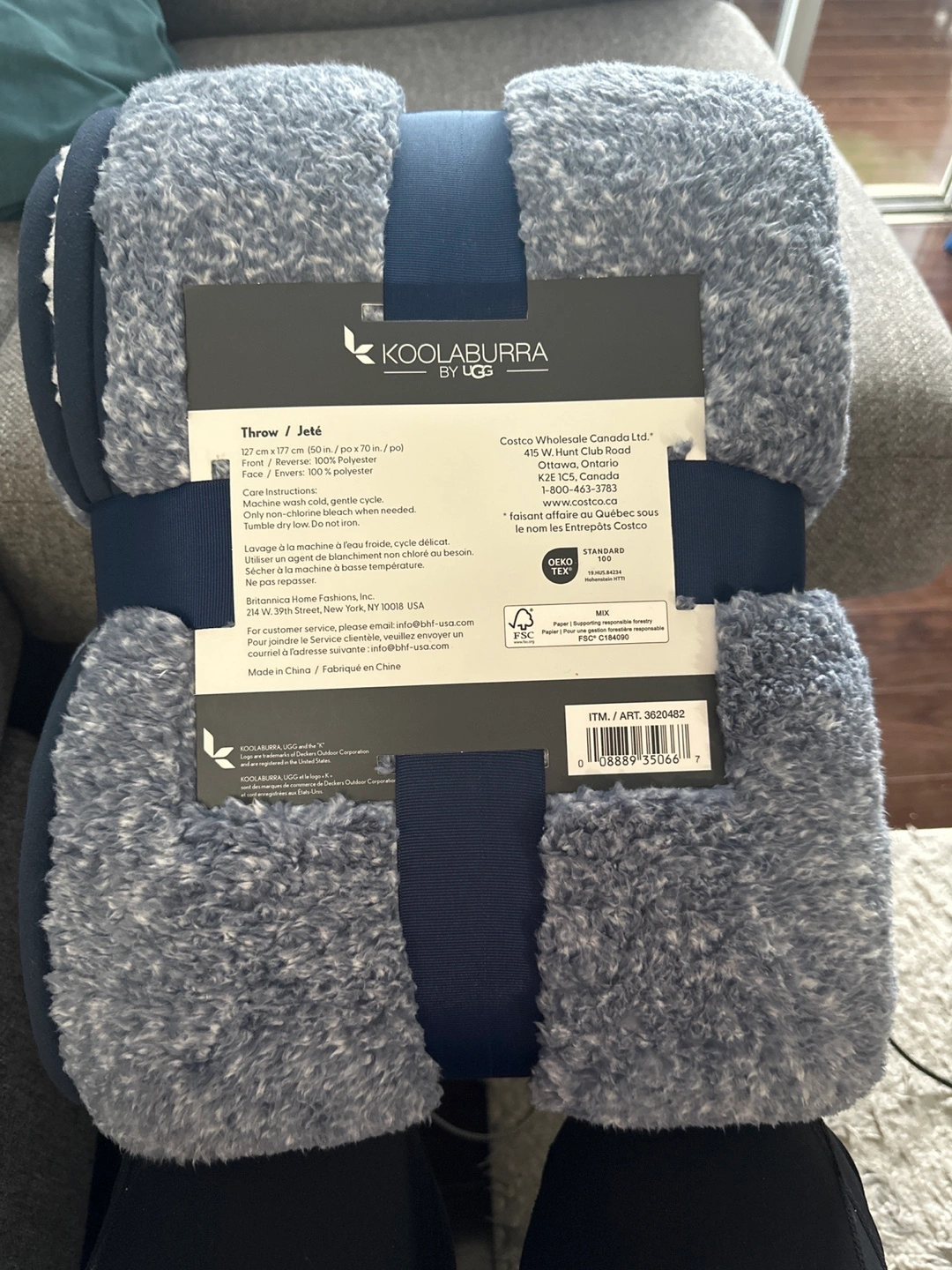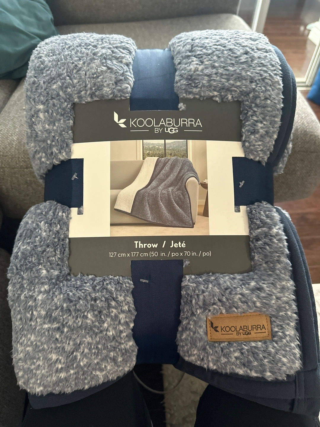 Brand new KOOLABURRA by UGG throw blanket! It measures 127 cm x 177 cm (50 in. x 70 in.). The front is 100% polyester, and the reverse is also 100% polyester. Machine washable in cold water on a gentle cycle, and only non-chlorine bleach when needed