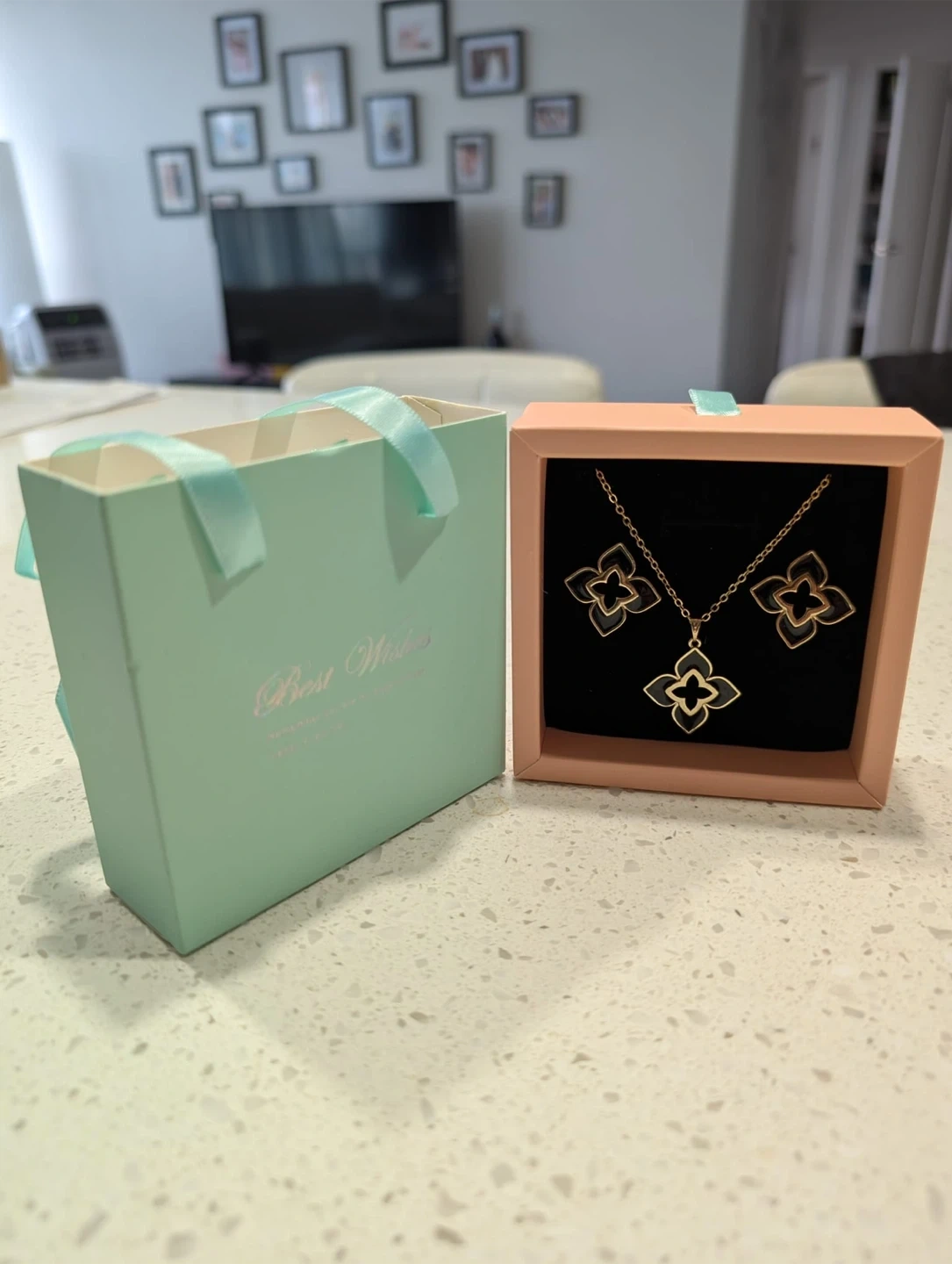 This is a brand new clover necklace and earring set! It comes in a cute gift box, perfect for gifting or treating yourself