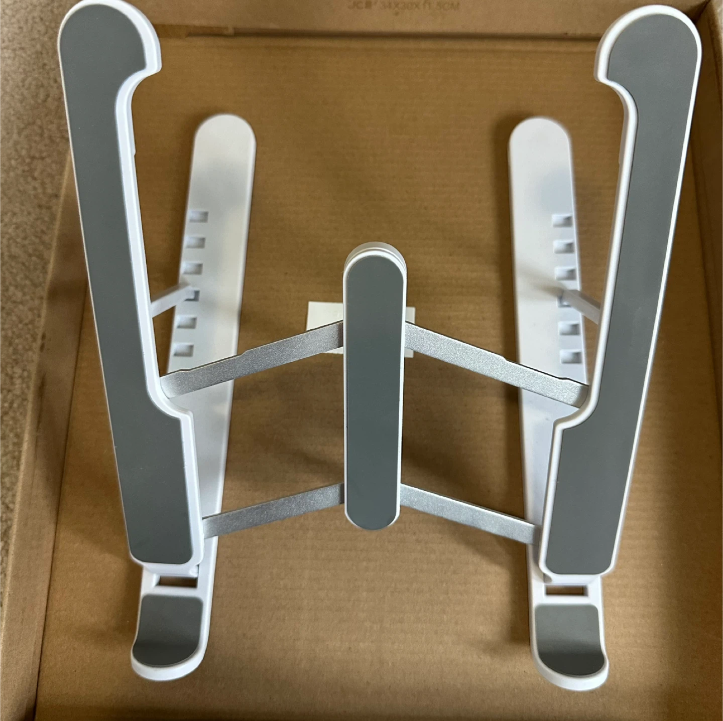 Selling a handy adjustable laptop stand in white and grey! It's in great condition and comes in its original box. It's perfect for keeping your laptop at a comfortable height while you work or study. Lightweight and portable, it's easy to take with you wherever you go