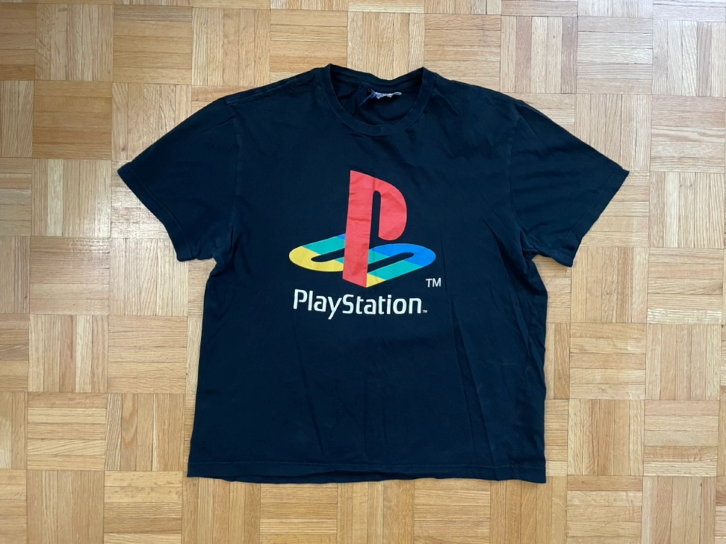Selling a black PlayStation t-shirt! It has the PlayStation logo on the front and the word "PlayStation" repeated in different colours on the back. A cool piece for any gamer!