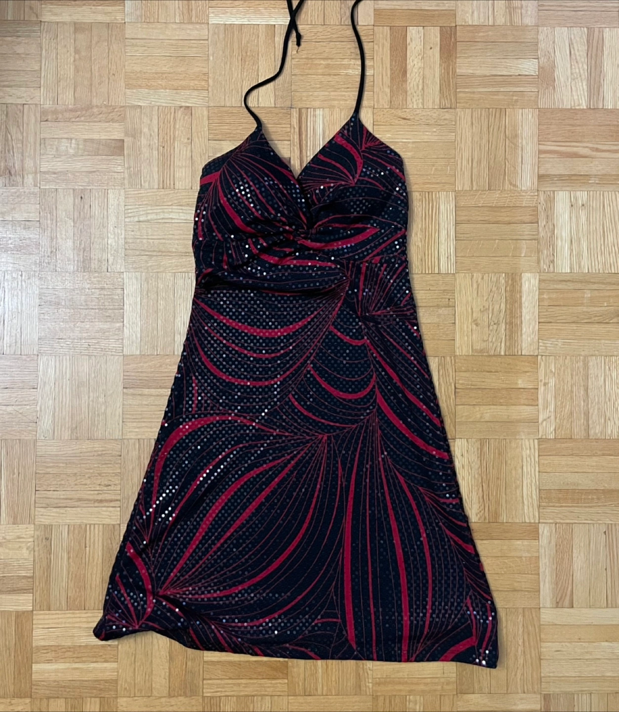 This is a cute halter dress with a black and red pattern! It's perfect for a night out or a special occasion. The dress has a flattering silhouette and is in great condition. Feel free to ask any questions!