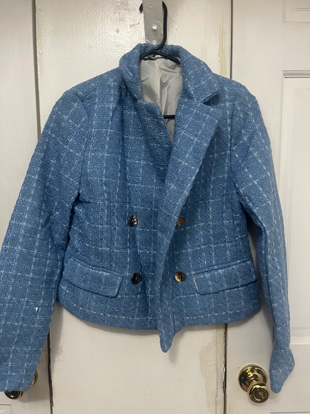 Here's a cute blue tweed blazer jacket! It's in good condition and ready for a new home. It has a double-breasted design with gold-tone buttons and two front pockets. Perfect for adding a touch of sophistication to any outfit