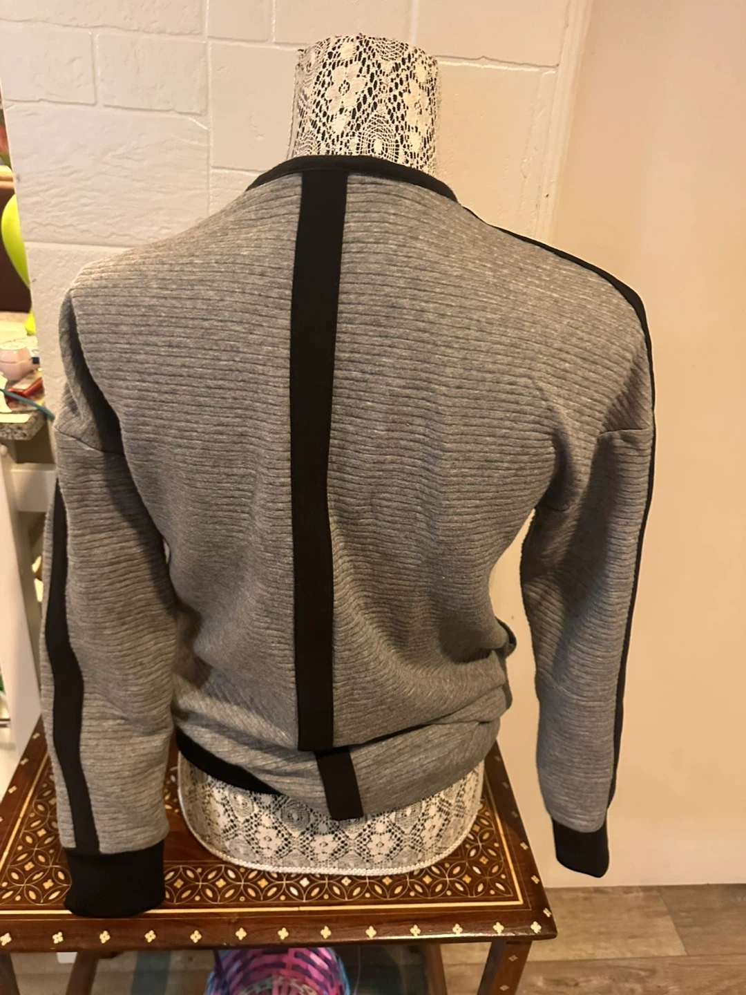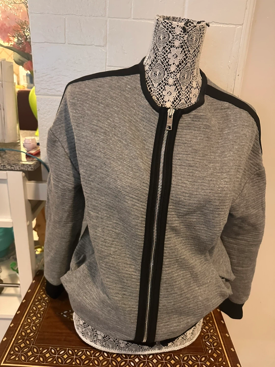 Selling a gently used DKNY bomber jacket. It's a stylish grey colour with black accents. The jacket has a quilted texture and a full zipper. Perfect for layering!