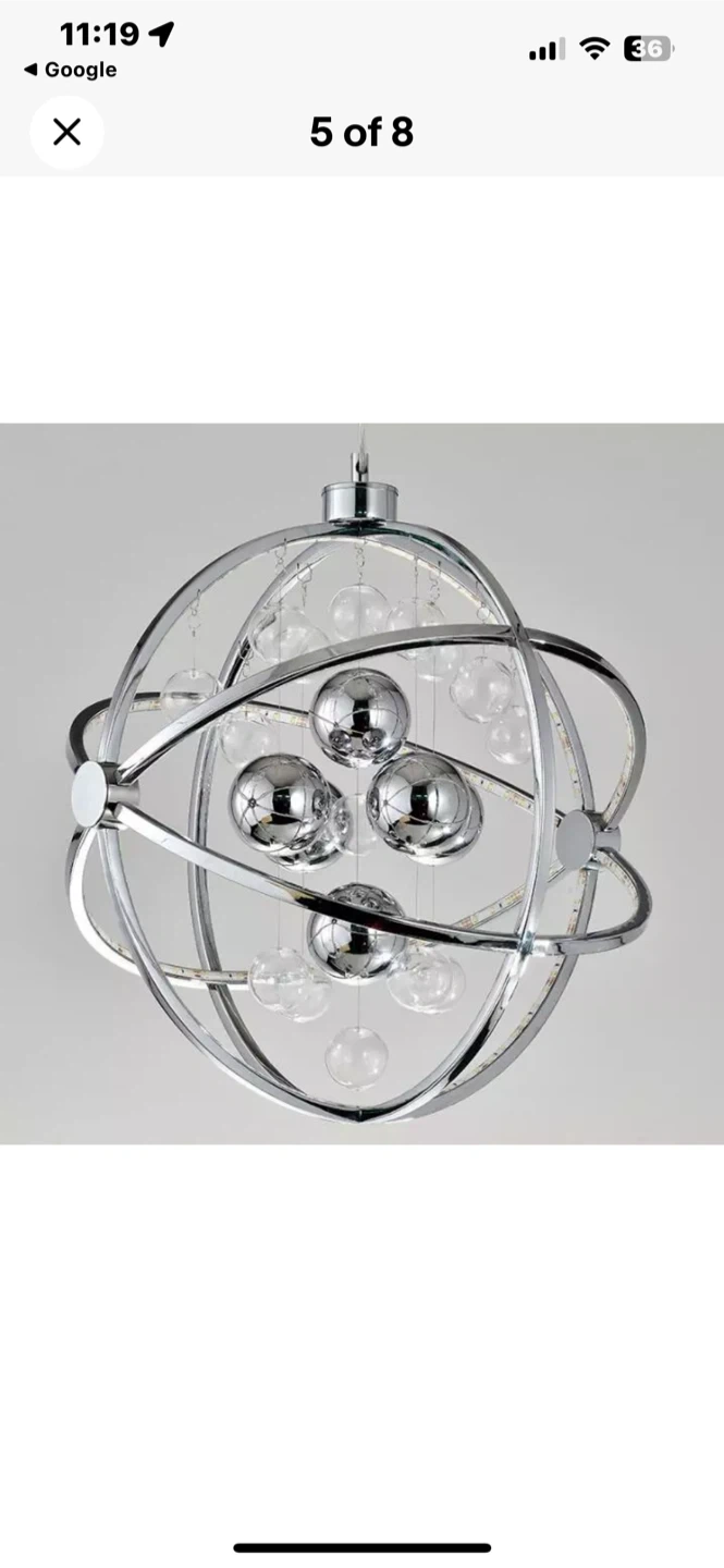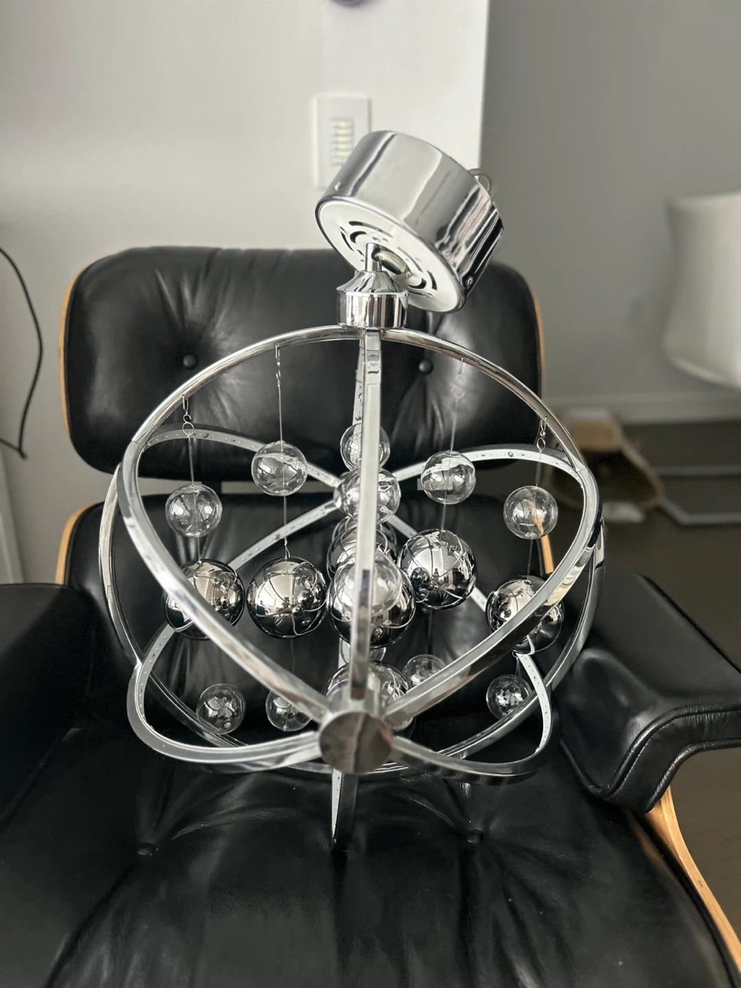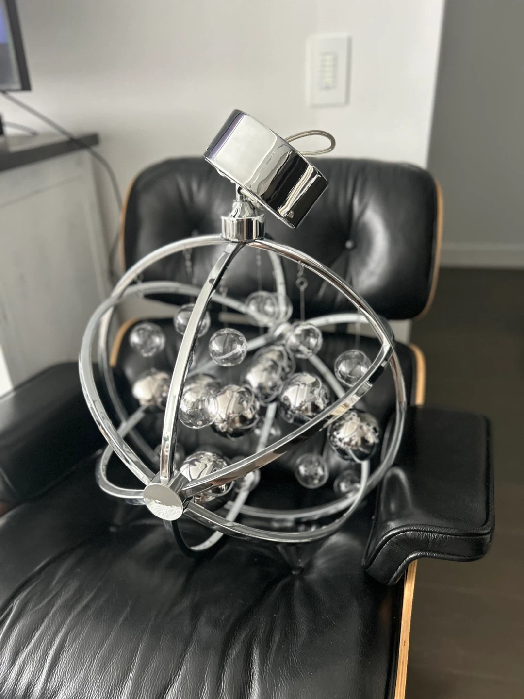 Selling a stylish chrome atom chandelier! It's a real statement piece that adds a modern touch to any room. The design features a spherical frame with clear and mirrored orbs, creating a unique lighting effect. Perfect for a dining room, living room, or entryway!