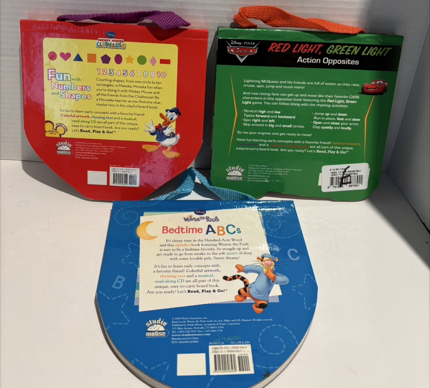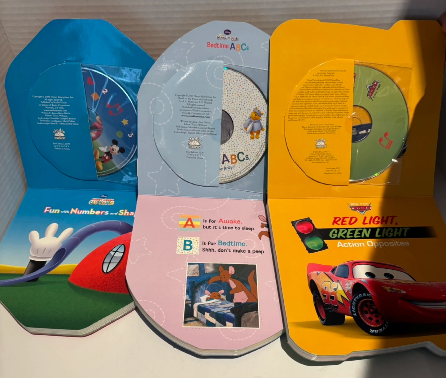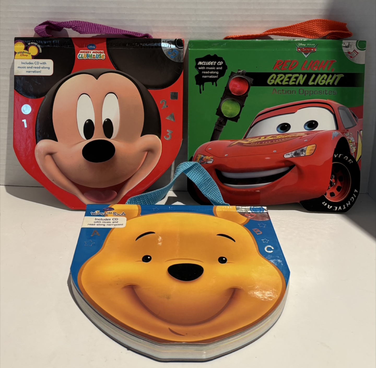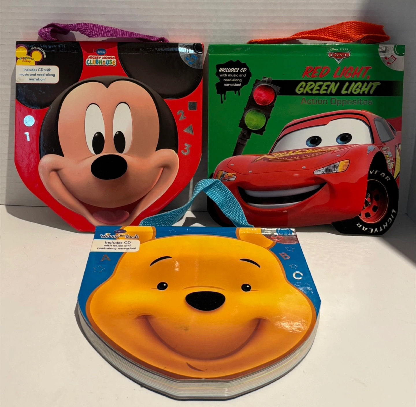 Selling a set of three Disney read-along books with CDs! Includes Mickey Mouse Clubhouse Fun with Numbers and Shapes, Winnie the Pooh Bedtime ABCs, and Disney Pixar Cars Red Light, Green Light Action Opposites. Each book includes a CD with music and read-along narration. Great for little ones!