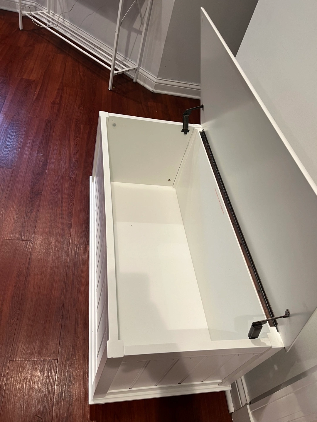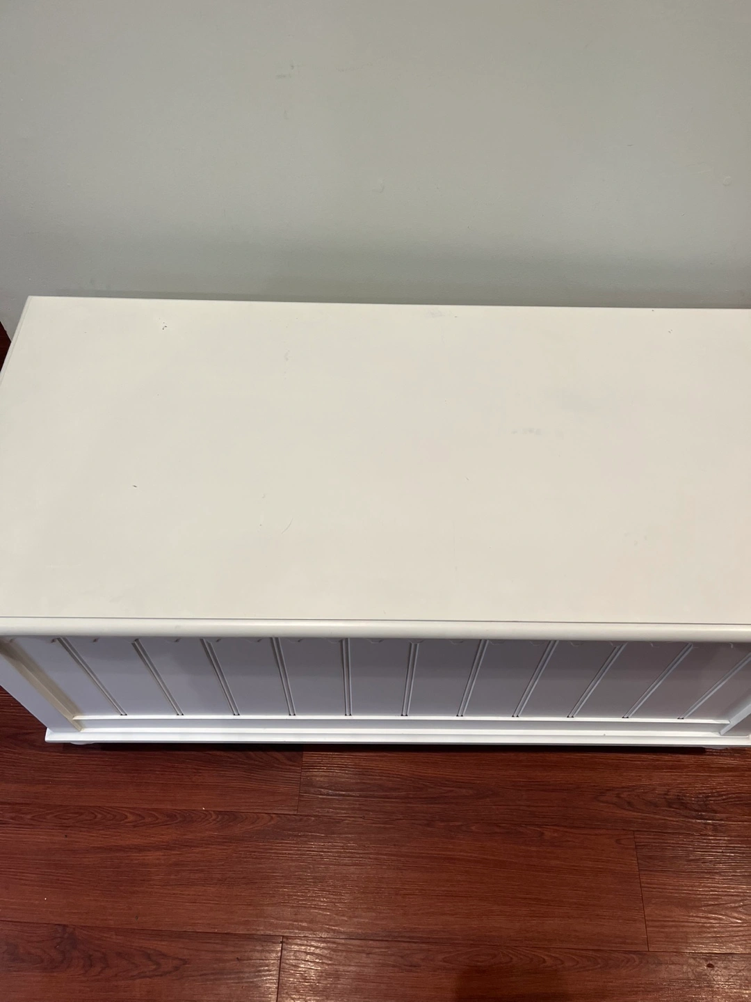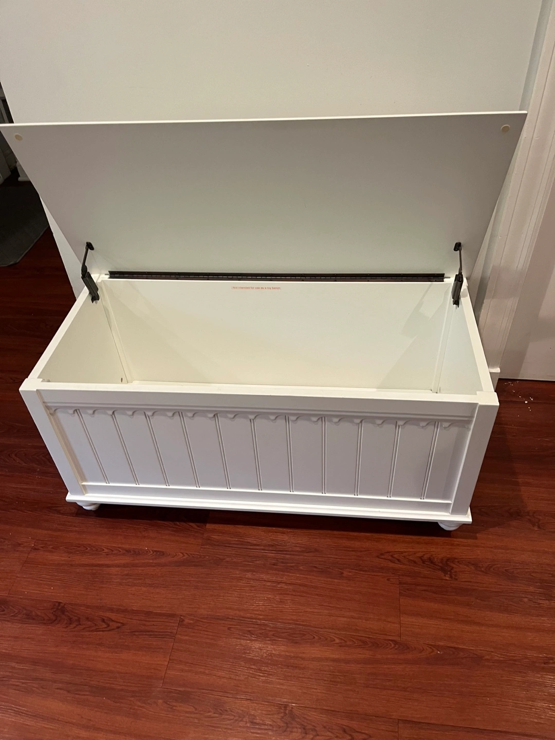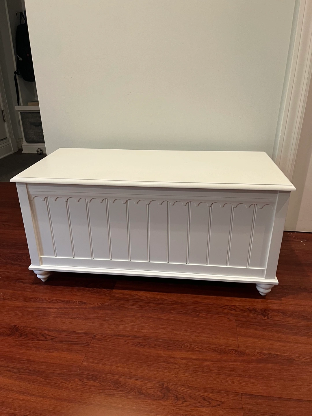 Here is a white storage trunk . It's a great piece for storing toys, blankets, or other household items. The trunk has a hinged lid for easy access and a classic design that will complement any decor. It's perfect for adding extra storage to any room in your home